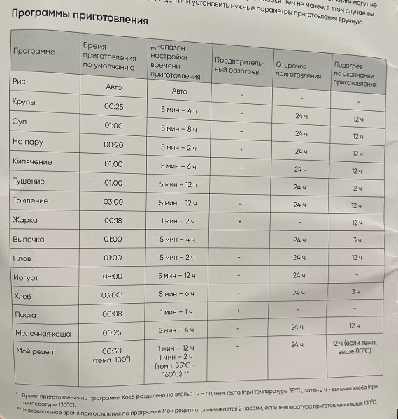 В комплекте также имеется книга рецептов, которая включает в себя 26 страниц и 73 рецепта, также там можно найти таблицу с подробным описанием программ приготовления и возможности установки в них отложенного старта и срабатывания автоподогрева.