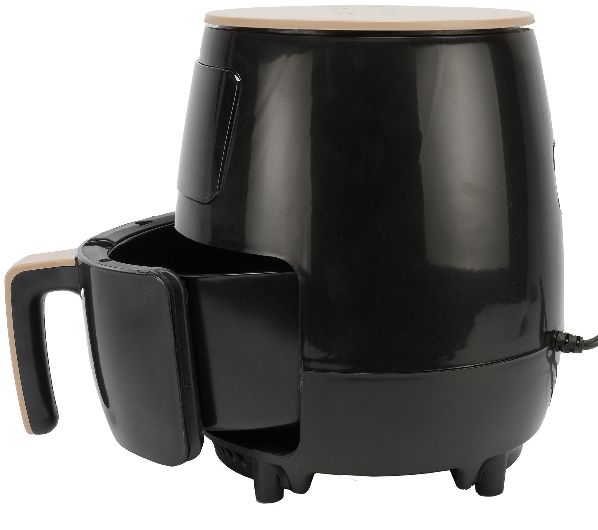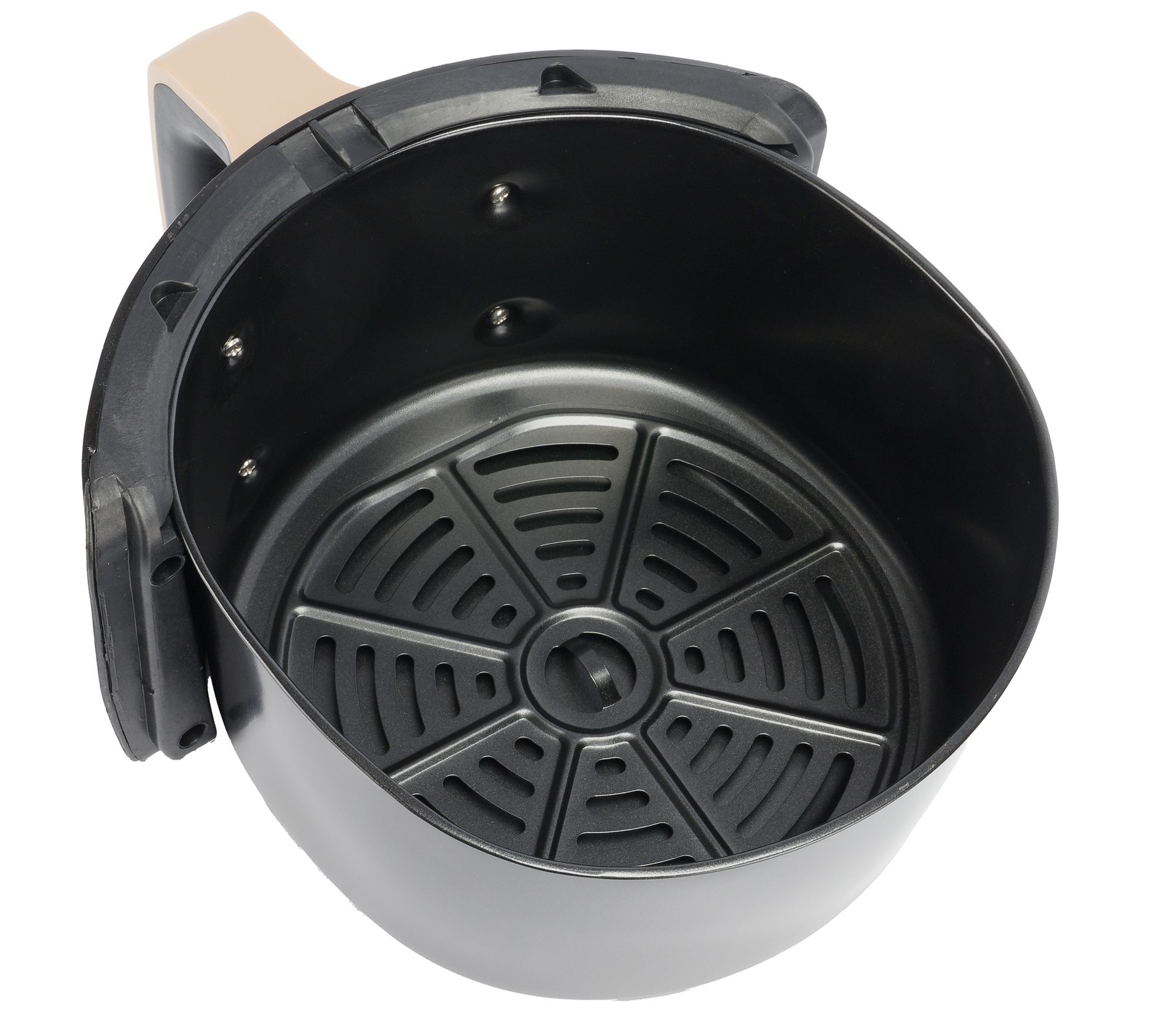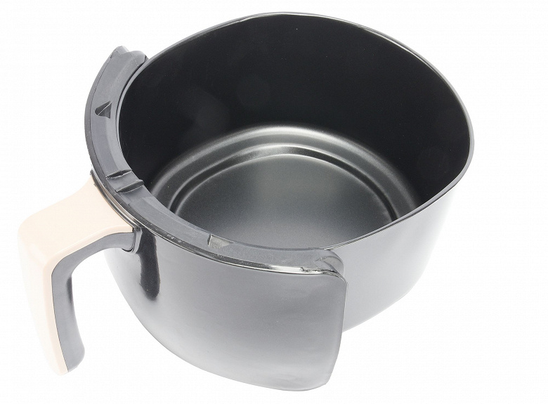 На изображении прибора сбоку видно устройство с немного выдвинутой чашей, в которой непосредственно происходит приготовление пищи. Здесь же можно отметить, что аэрофритюрница устойчиво располагается на поверхности благодаря ножкам. Внешняя сторона чаши, включая зону крепления ручки, также выполнена из пластика и гармонично вписывается в общий дизайн корпуса.