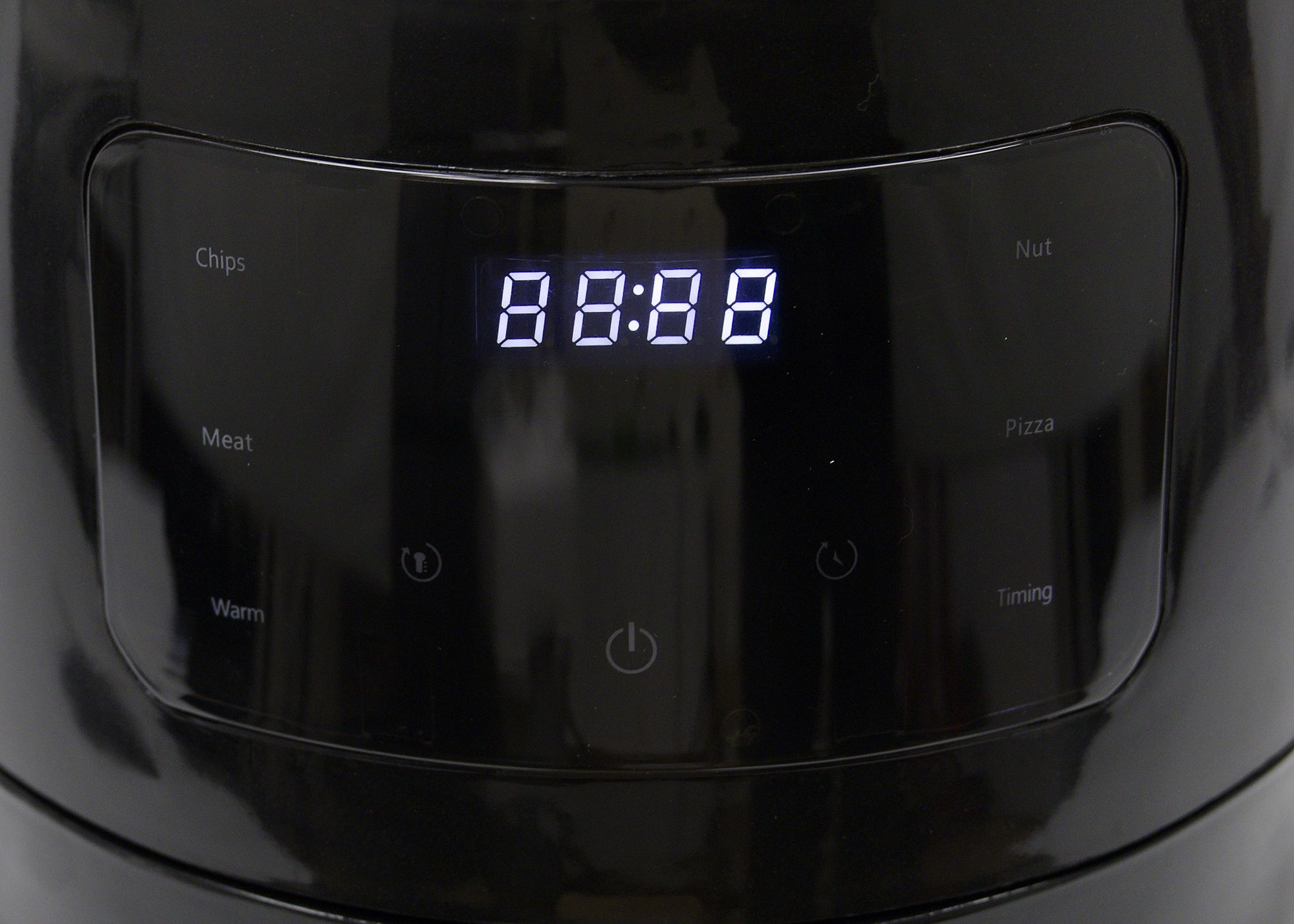 Управление аэрофритюрницей KaringBee JD389 осуществляется с помощью сенсорной панели, расположенной в верхней части прибора, сразу над чашей. По центру панели находится дисплей, на котором отображаются выбранные параметры: время приготовления, температура и таймер.