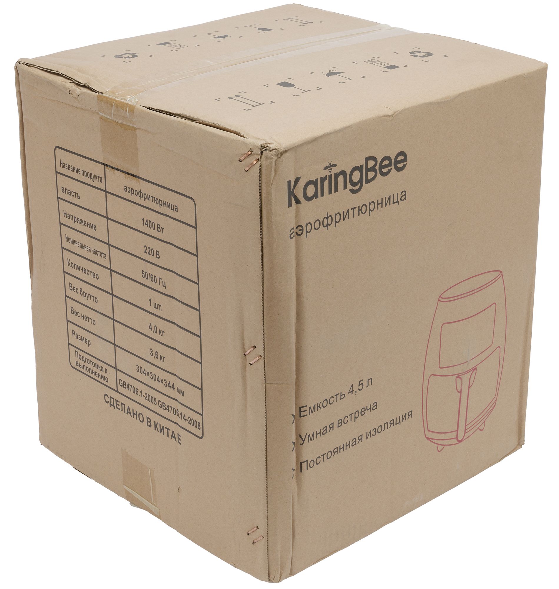 Аэрофритюрница KaringBee JD389 поступила к нам в коробке из светло-коричневого производственного картона. В углах упаковка дополнительно усилена металлическими скобами степлера, вероятно, для повышения жесткости и сохранности при транспортировке.