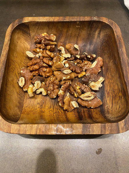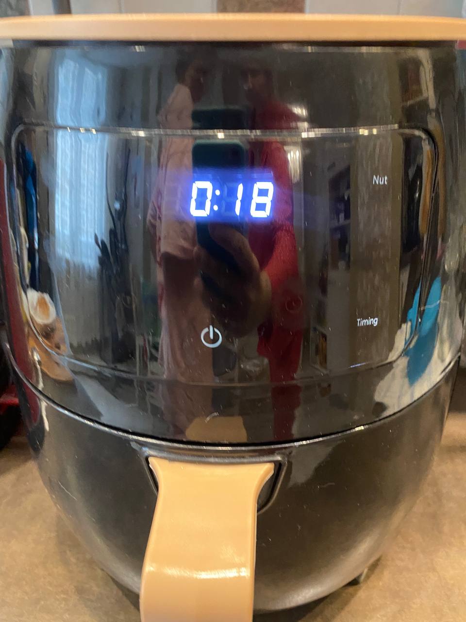 Для проверки функции Timing и режима Nut мы взяли сырые грецкие орехи. По умолчанию режим Nut выставляет температуру 185 °C, но мы установили необходимую нам температуру — 160 °C, и скорректировали время подсушивания на 10 минут. Орехи поместили на решетку в емкость для жарки.