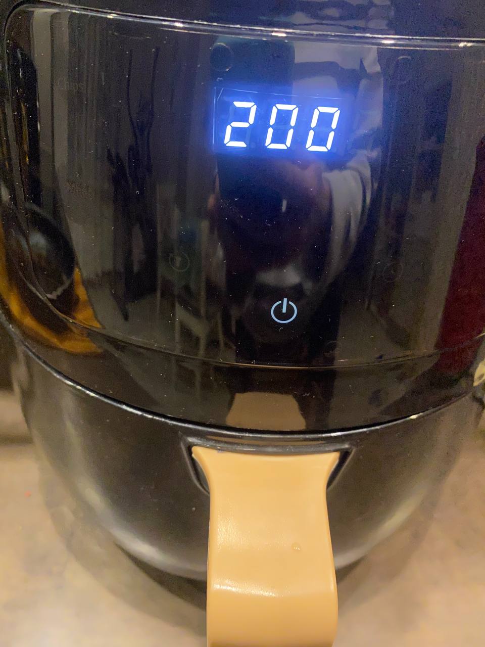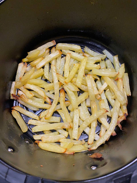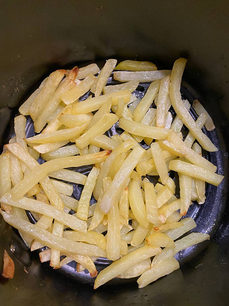 Решили увеличить температуру до 200 °C и продолжили наблюдать за процессом. Через 5 минут картофель начал активно румяниться, после чего мы снизили температуру до 190 °C.