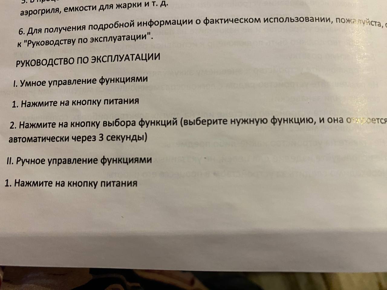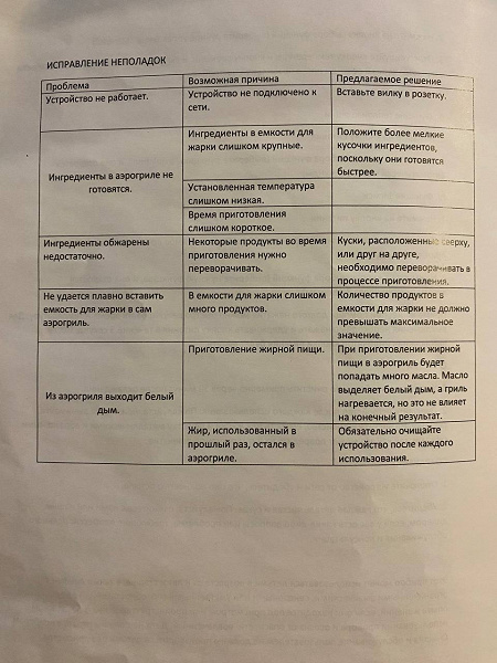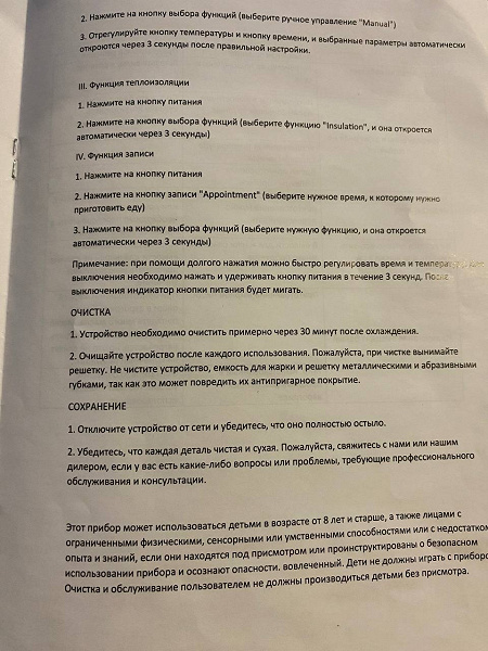Несмотря на это, общие рекомендации по безопасности понятны: не включать прибор мокрыми руками, подключать к исправной розетке, оставлять зазор вокруг устройства, следить за работой. Также есть напоминания о домашнем использовании и запрет наливать масло или другие жидкости в емкость для жарки.