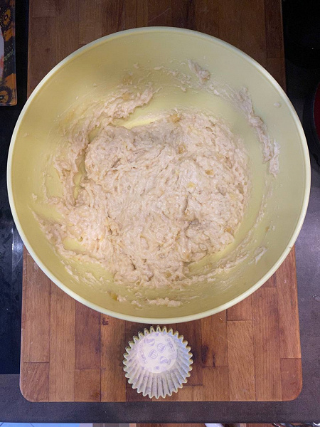 Муку смешали с разрыхлителем и сахаром. Добавили растопленное сливочное масло, размятый вилкой банан, два яйца и 4 ст. л. йогурта. Всё тщательно перемешали до однородной массы. Полученное тесто разложили по 12 формочкам, примерно по 1,5 ст. л. в каждую. Однако в емкость для жарки аэрофритюрницы одновременно поместились только 5 формочек, поэтому выпечку пришлось выполнять партиями.