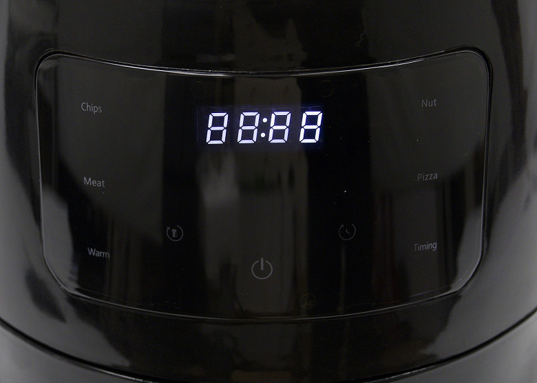 Слева от дисплея расположены сенсорные кнопки с надписями на английском языке: Chips, Meat, Warm, что можно перевести как «Чипсы», «Мясо» и «Теплый» (вероятно, функция подогрева). Напротив них, справа на панели, находятся еще три сенсорные кнопки: Nut, Pizza, Timing, что мы перевели как «Орехи», «Пицца» и «Время».