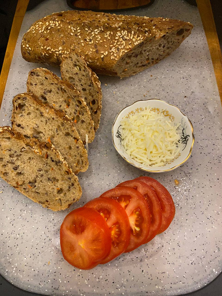 Ингредиенты: багет, томаты, натертый сыр, сухой чеснок, оливковое масло.