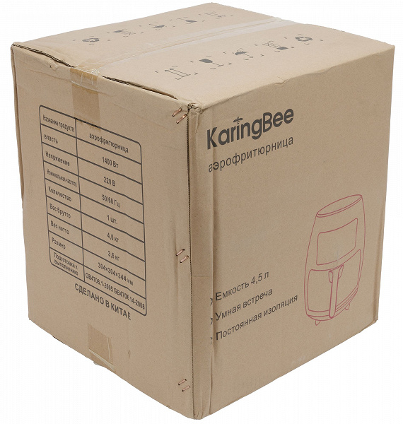На боковых сторонах коробки с обеих сторон размещены основные технические характеристики устройства, оформленные в виде таблицы. С тыльной стороны упаковки повторяется то же схематичное изображение, что и спереди, а также присутствуют две наклейки. Именно на одной из них удалось обнаружить обозначение модели аэрофритюрницы — KaringBee JD389. В других местах на коробке модель не указана, поэтому для подтверждения пришлось дополнительно свериться с информацией в интернете. В результате мы убедились, что модель определена верно, а это не внутренние обозначения поставщиков.