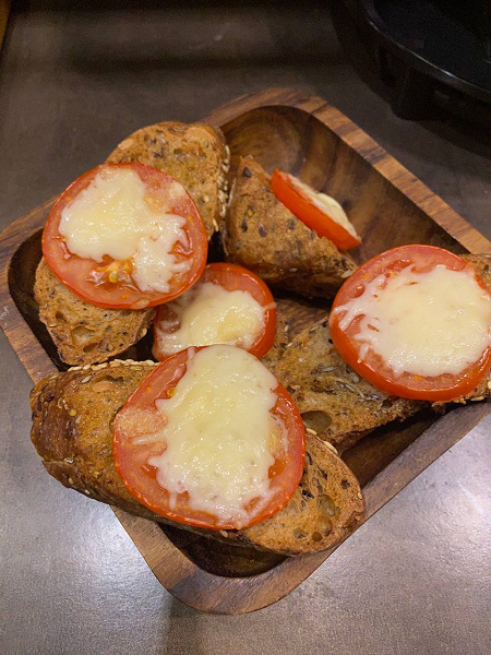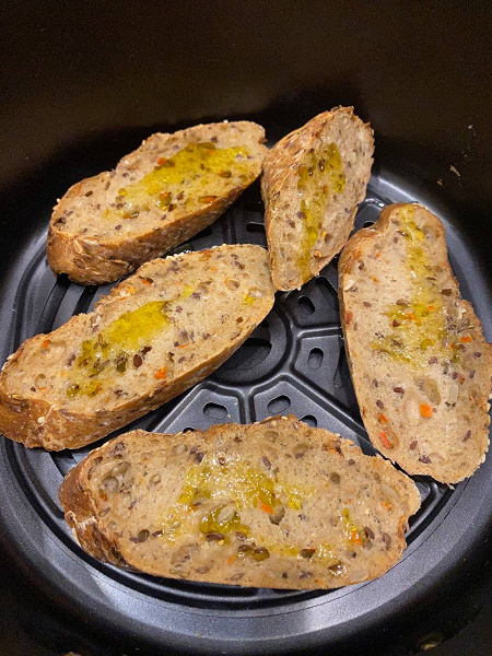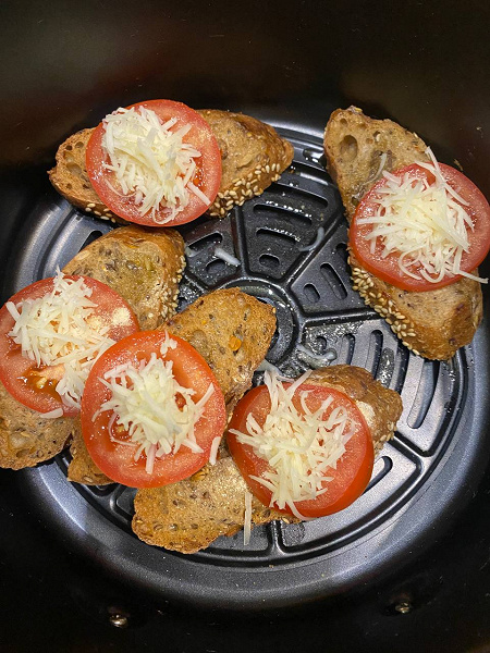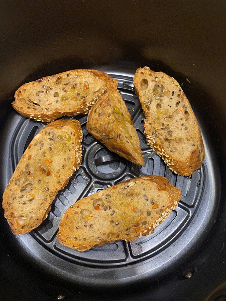 Мы выбрали режим Pizza, 200 °C на 15 минут. Через 3 минуты у нас появилась корочка, и мы перевернули ломтики багета на другую сторону.