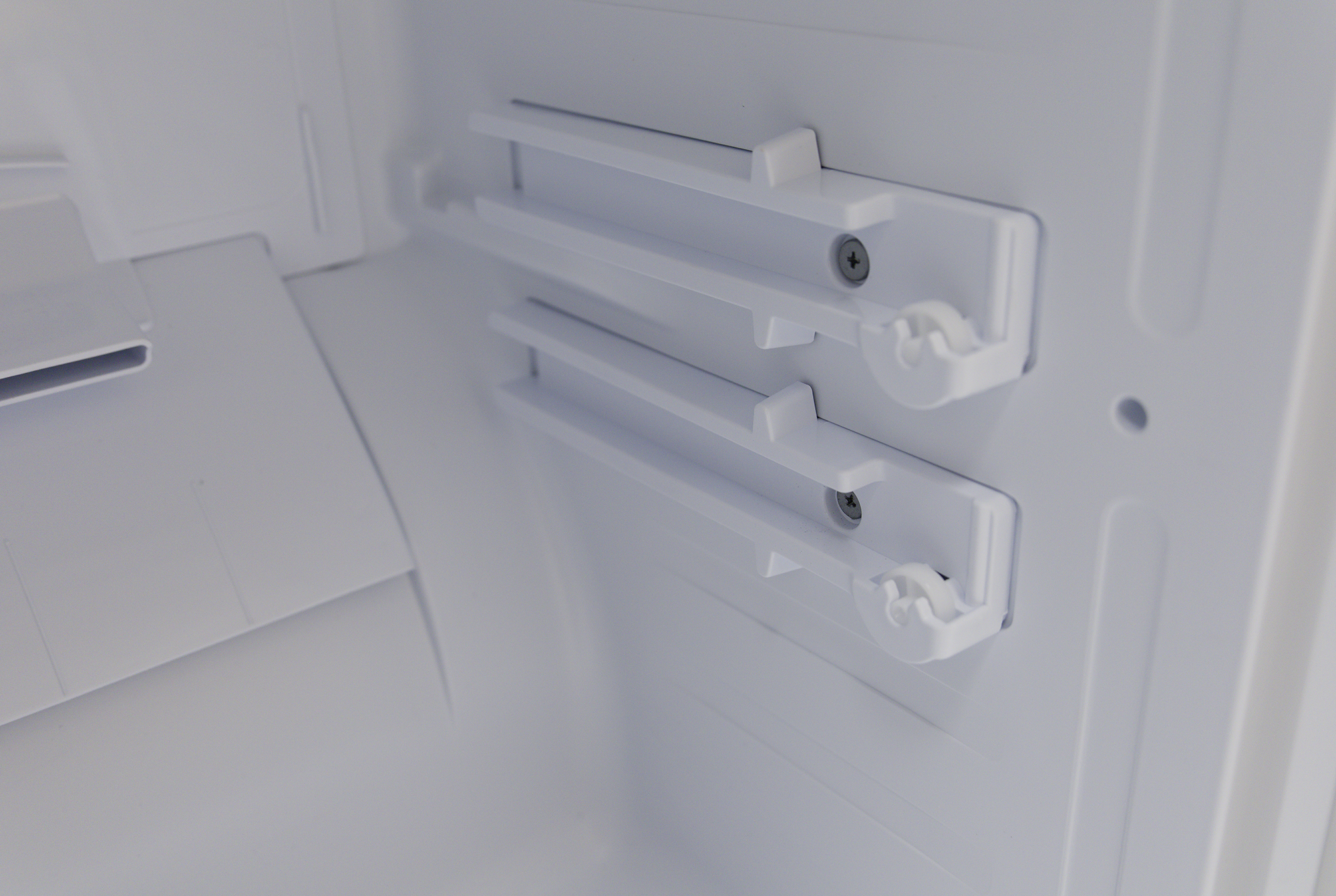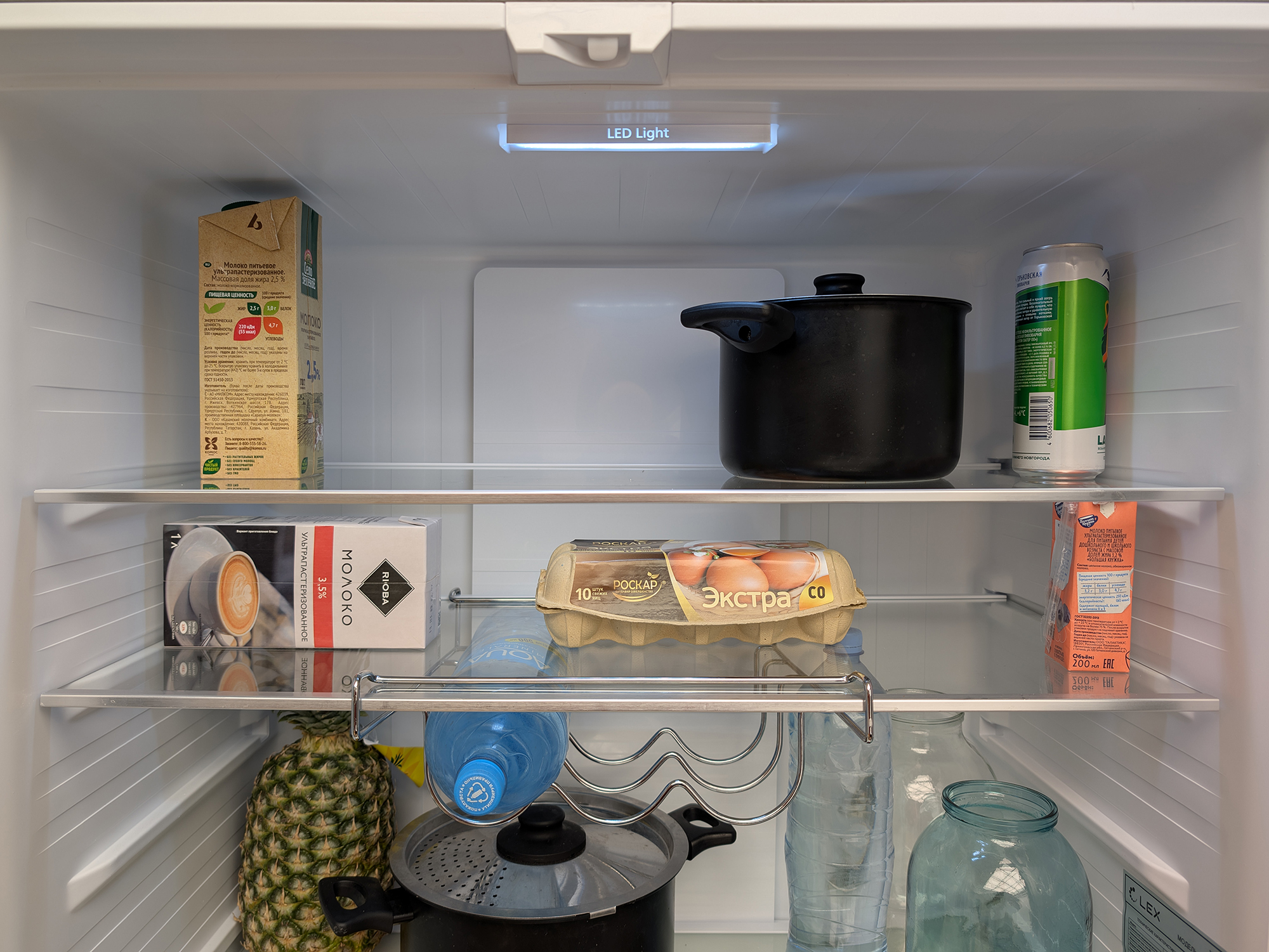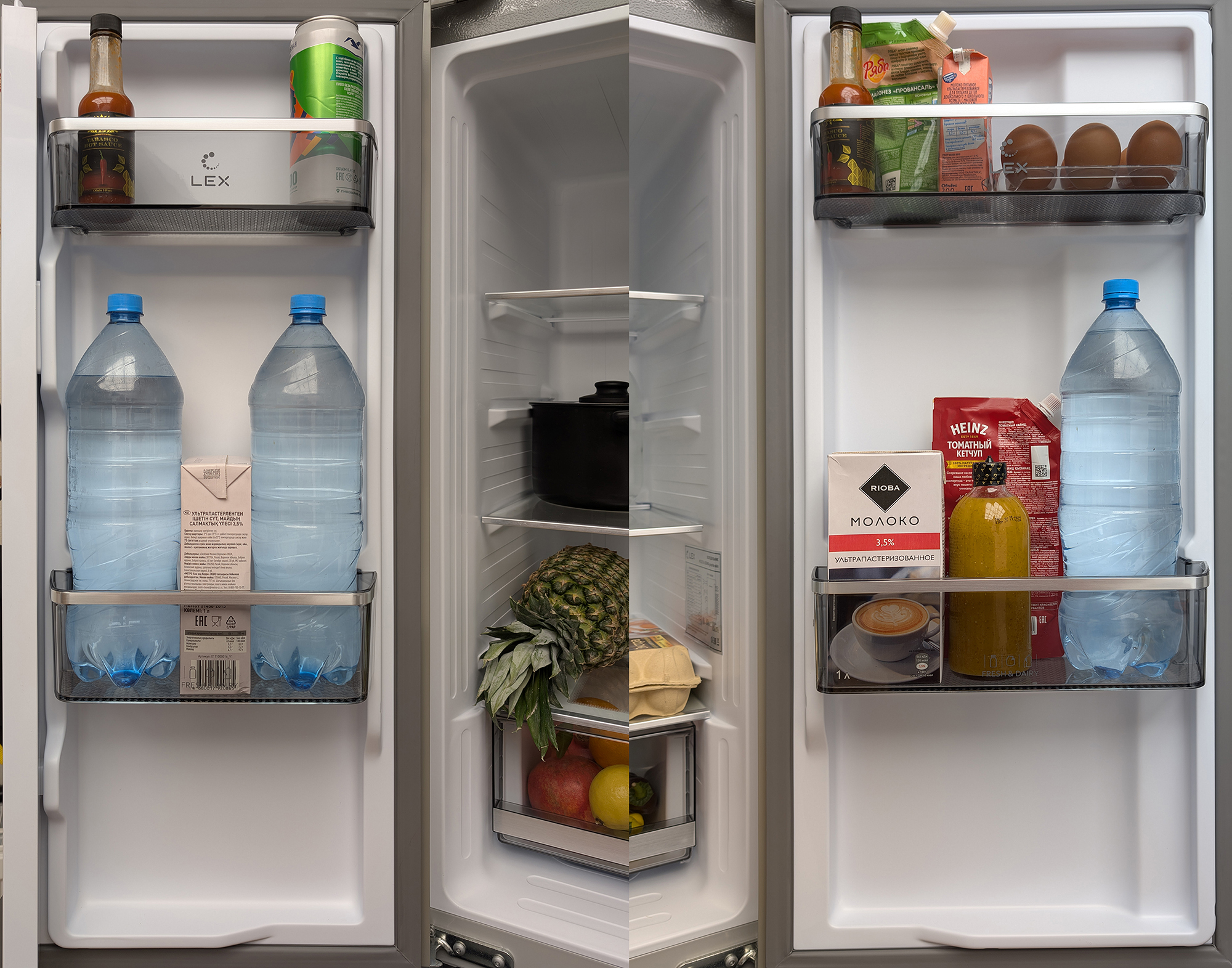 Дверцы слегка различаются по ширине, но возможности для хранения в них практически одинаковые. На нижние полки можно поставить бутылки объемом до 2 литров, а верхние подойдут для не слишком объемных предметов: контейнеров для яиц, маленьких пакетов со сливками, небольших коробок и банок. Возможности изменять положение полок здесь нет.