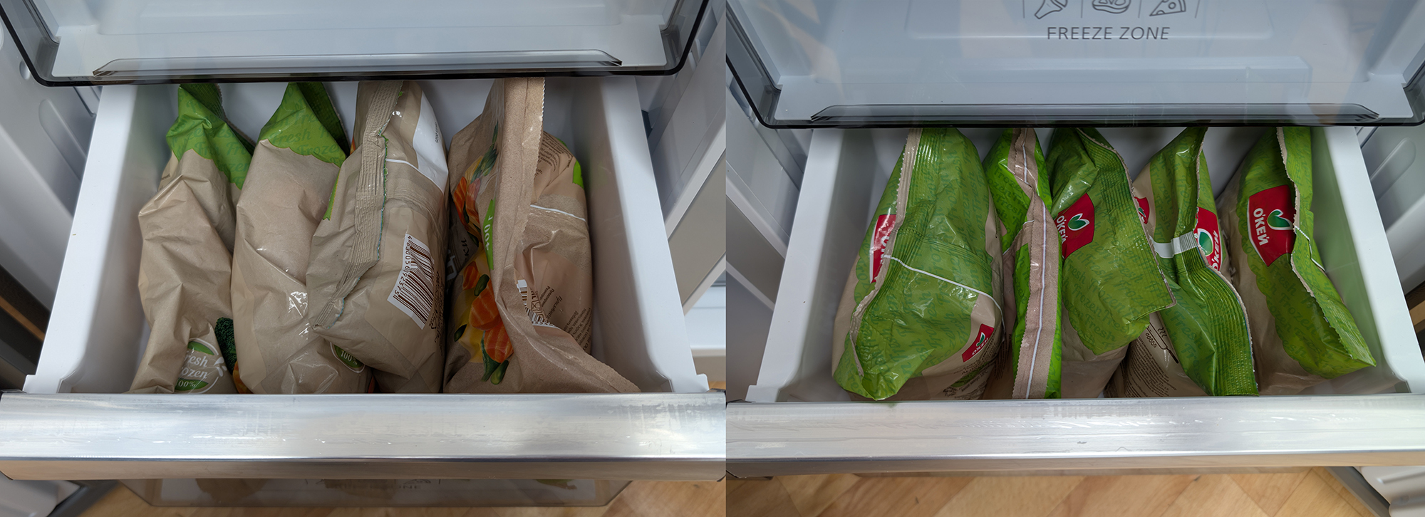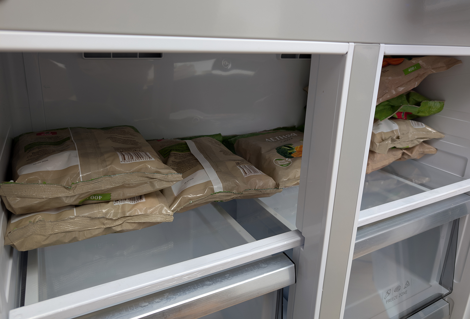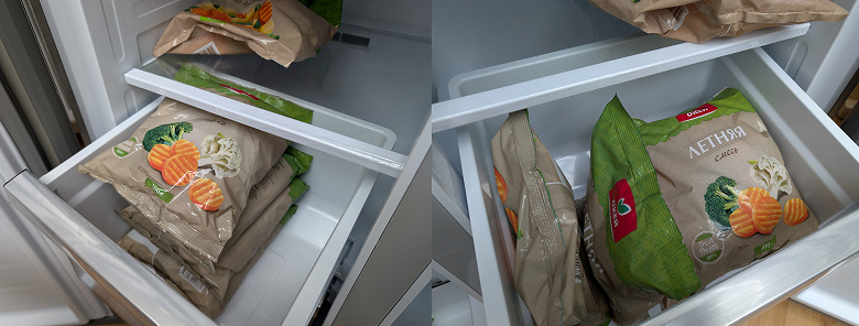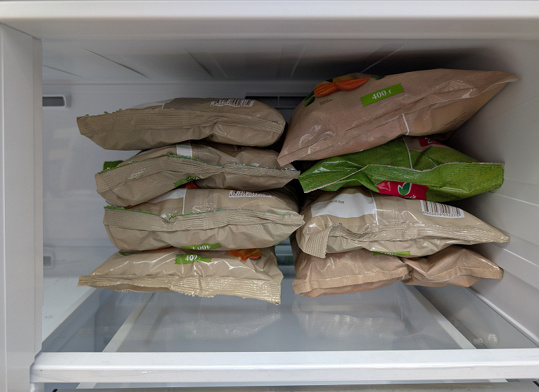 Для оценки емкости морозильной камеры мы по традиции используем 400-граммовые пакеты с замороженными овощами. Имеющегося под рукой количества упаковок, разумеется, не хватило для того, чтобы полностью забить широкую и объемную морозилку, но масштаб на фотографии передан наглядно.