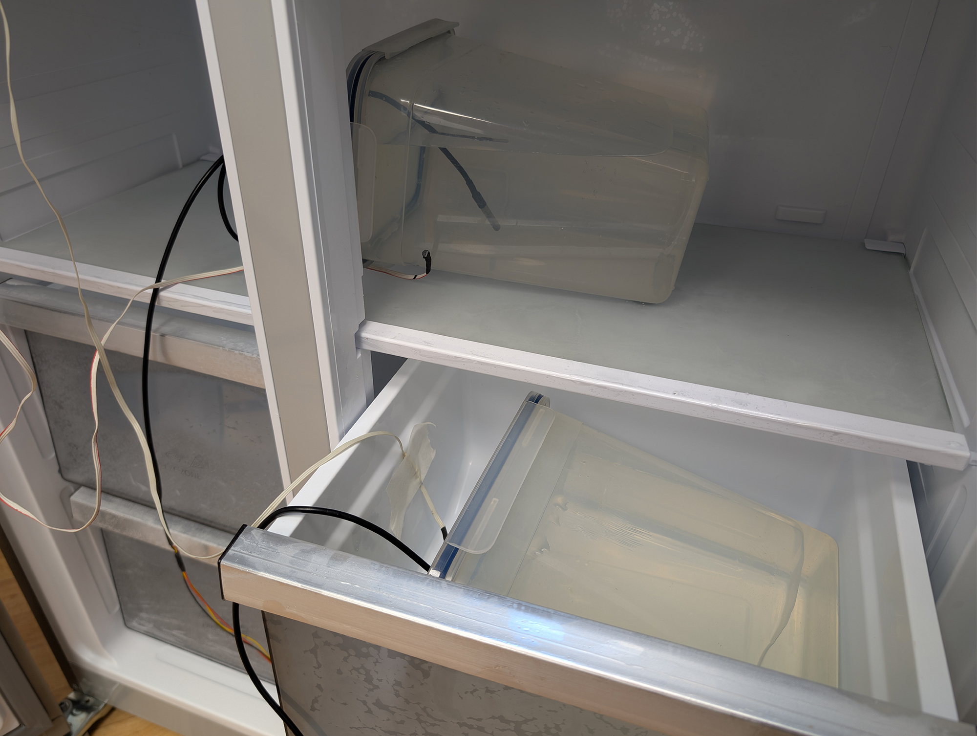 Помимо датчиков температуры воды использовались датчики температуры воздуха. Их мы поместили рядом с контейнерами в те же ящики — так, чтобы поверхность сенсоров не контактировала напрямую с элементами корпуса морозильной камеры.
