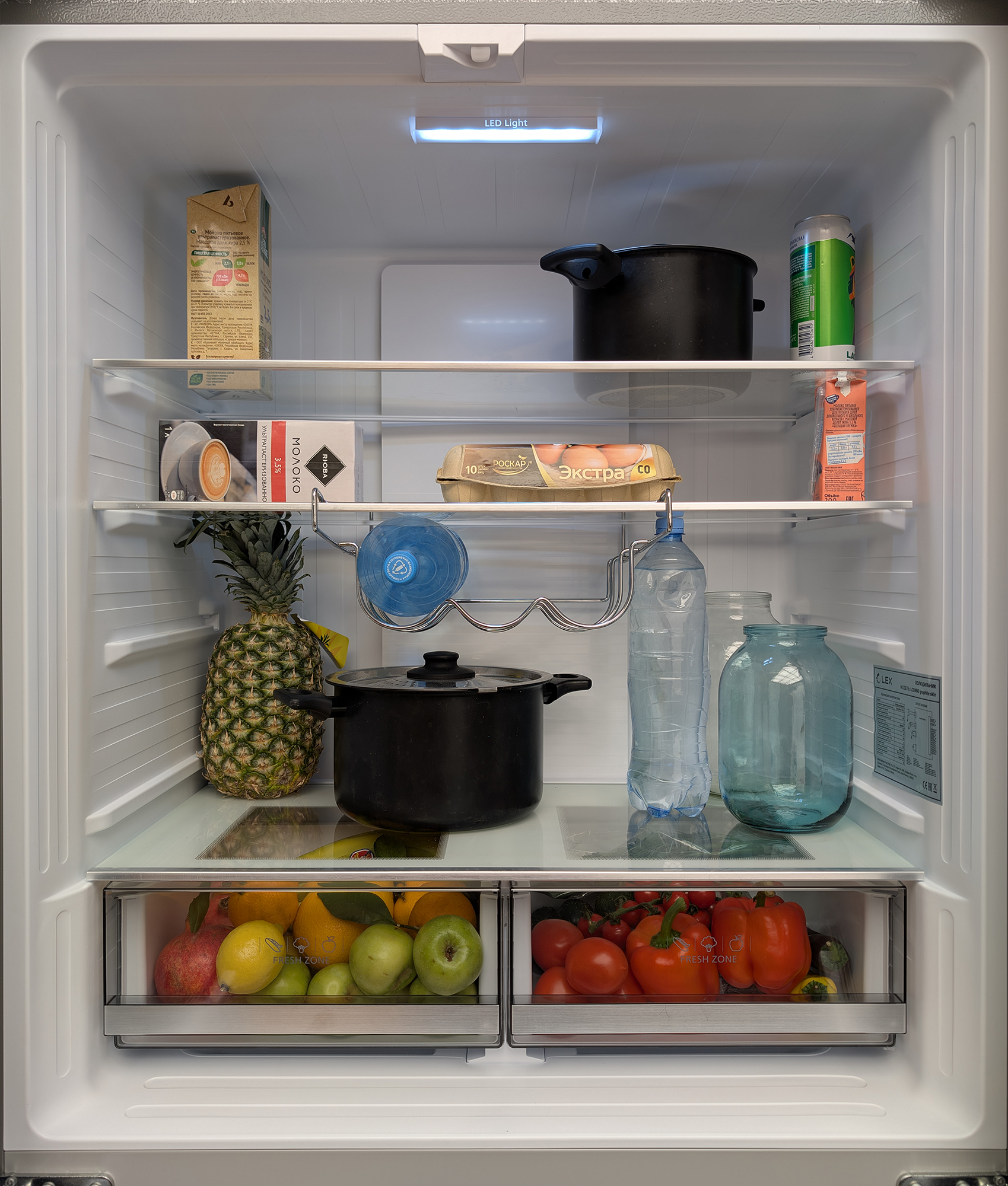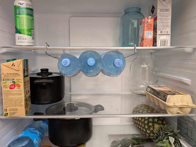Впечатляющие ширина и объем холодильной камеры позволяет без труда разместить в ней даже крупную посуду: на полках свободно встают трех- и пятилитровые кастрюли и трехлитровые банки.