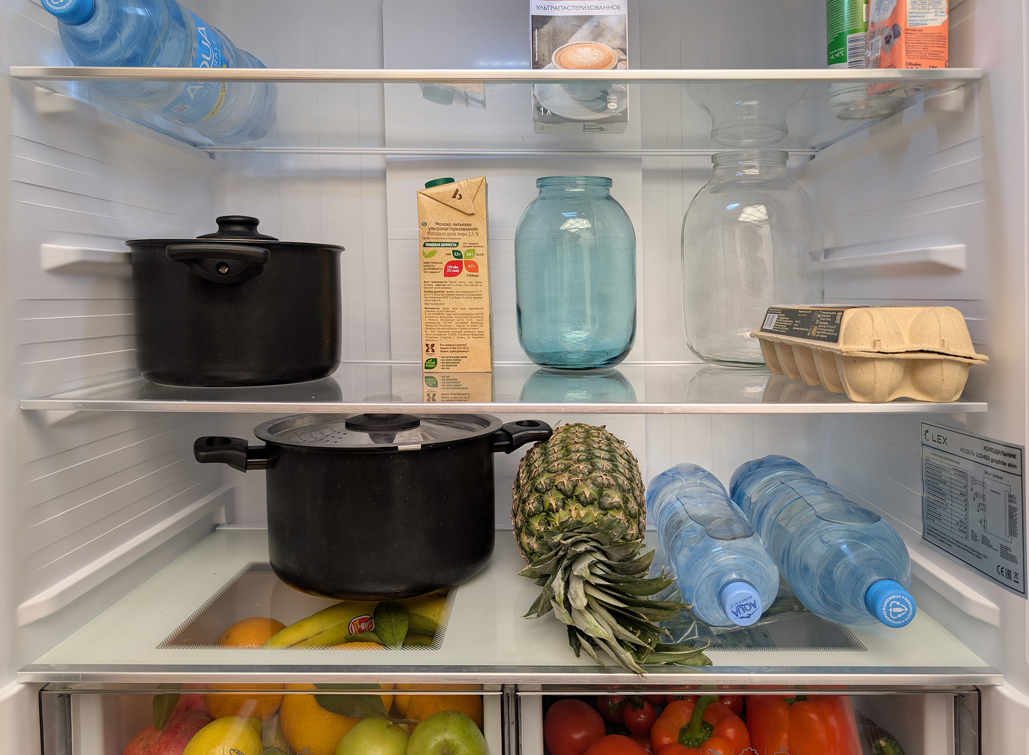 Как и во всех предыдущих обзорах, мы не только измеряем емкость холодильной камеры линейкой и рулеткой, но и демонстрируем ее вместительность на более наглядных примерах.