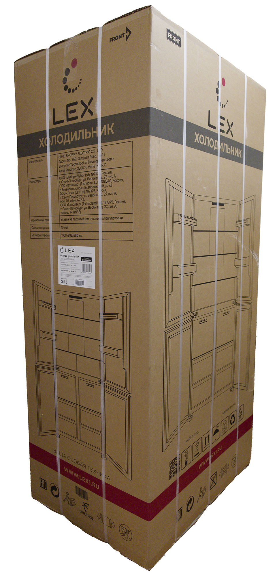 Холодильник приехал к нам на тестирование в упаковке из картона и пенопласта, усиленной капроновыми стропами. Передняя сторона коробки украшена изображением устройства с распахнутыми дверцами, а на боковых стенках можно ознакомиться с краткими техническими характеристиками.