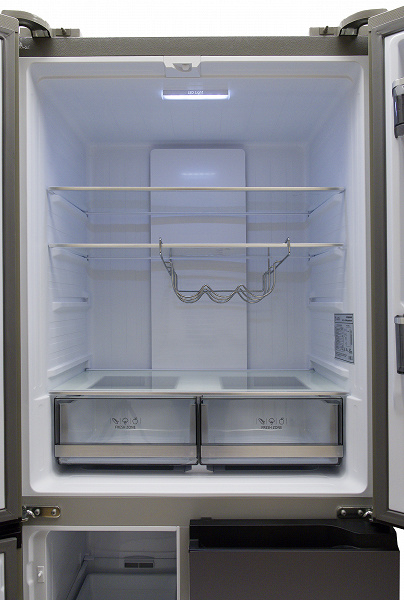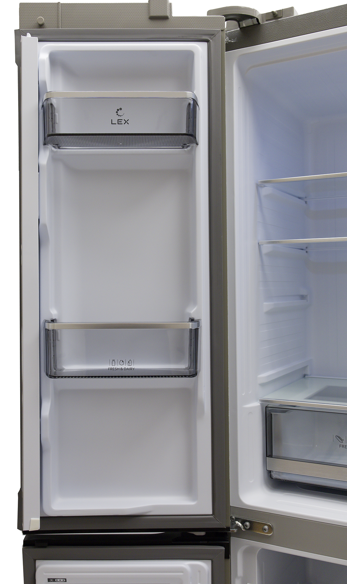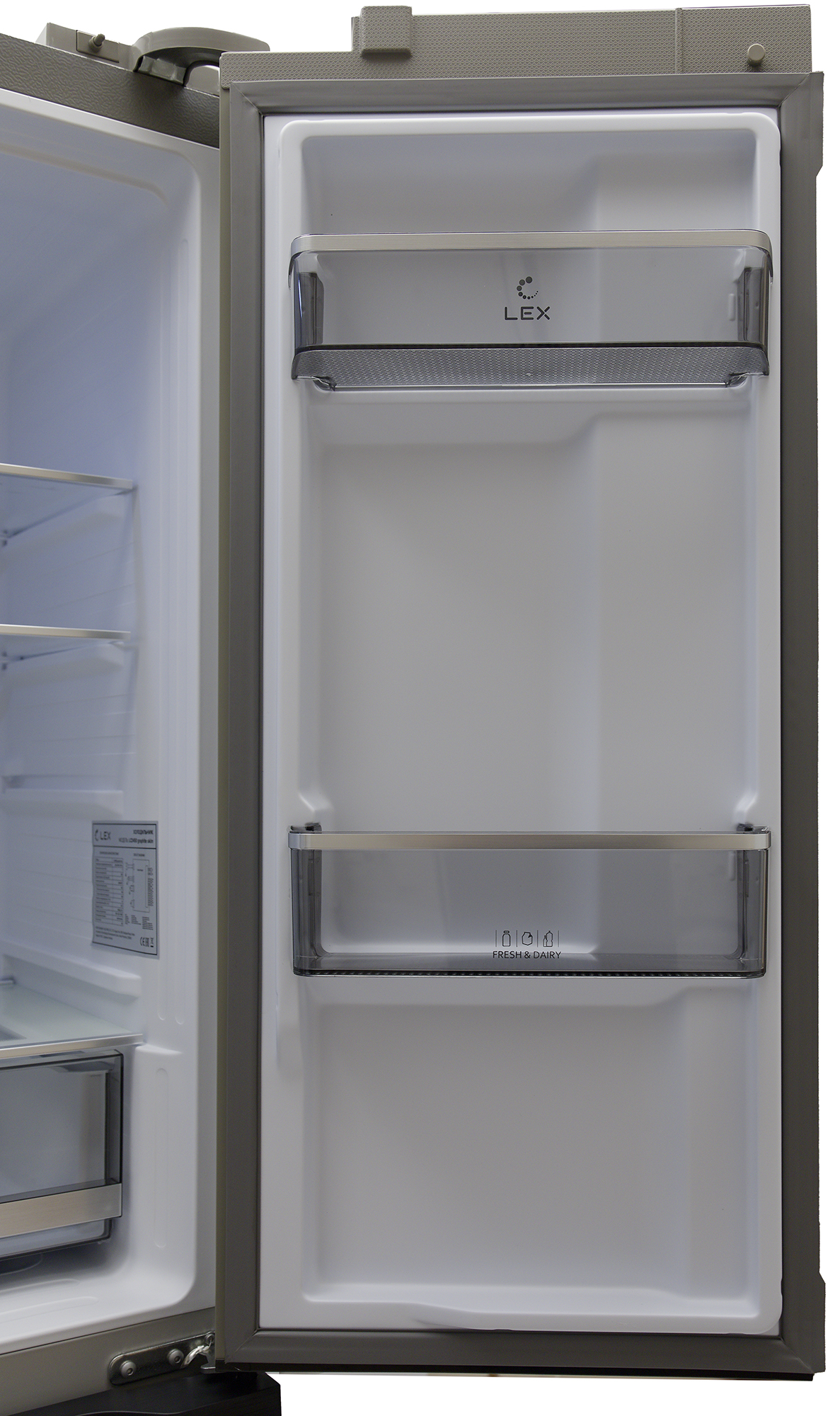 У Lex LCD450 Graphite Point две камеры, которые закрыты четырьмя дверцами: левая пара чуть поуже, правая — пошире. Холодильная камера находится сверху, морозильная — под ней. Общий полезный объем устройства составляет, согласно измерениям производителя, 417 литров.