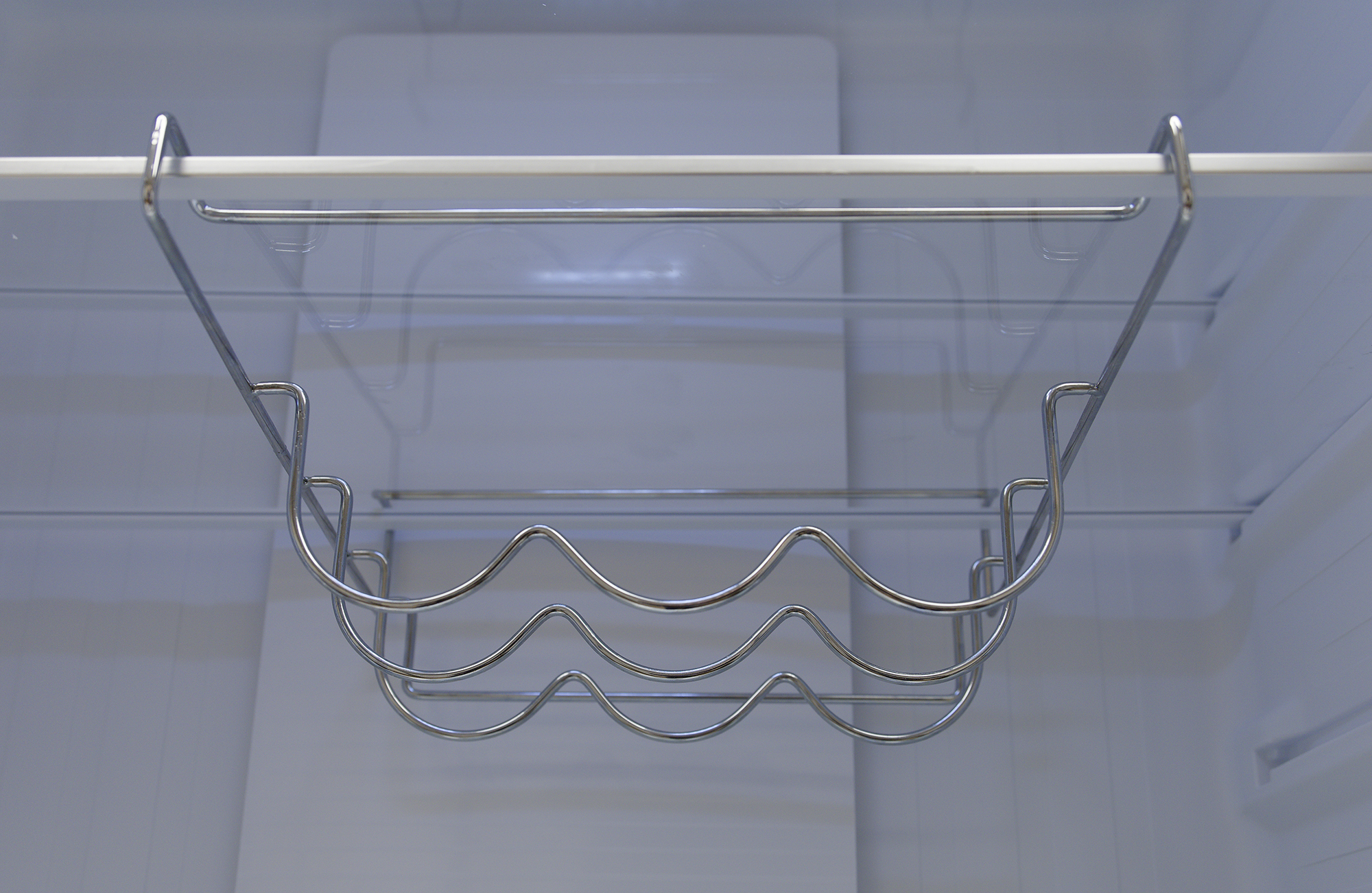 Металлический держатель для бутылок может быть установлен на любую из двух полок. Если в нем отсутствует необходимость, приспособление можно снять и убрать на хранение.