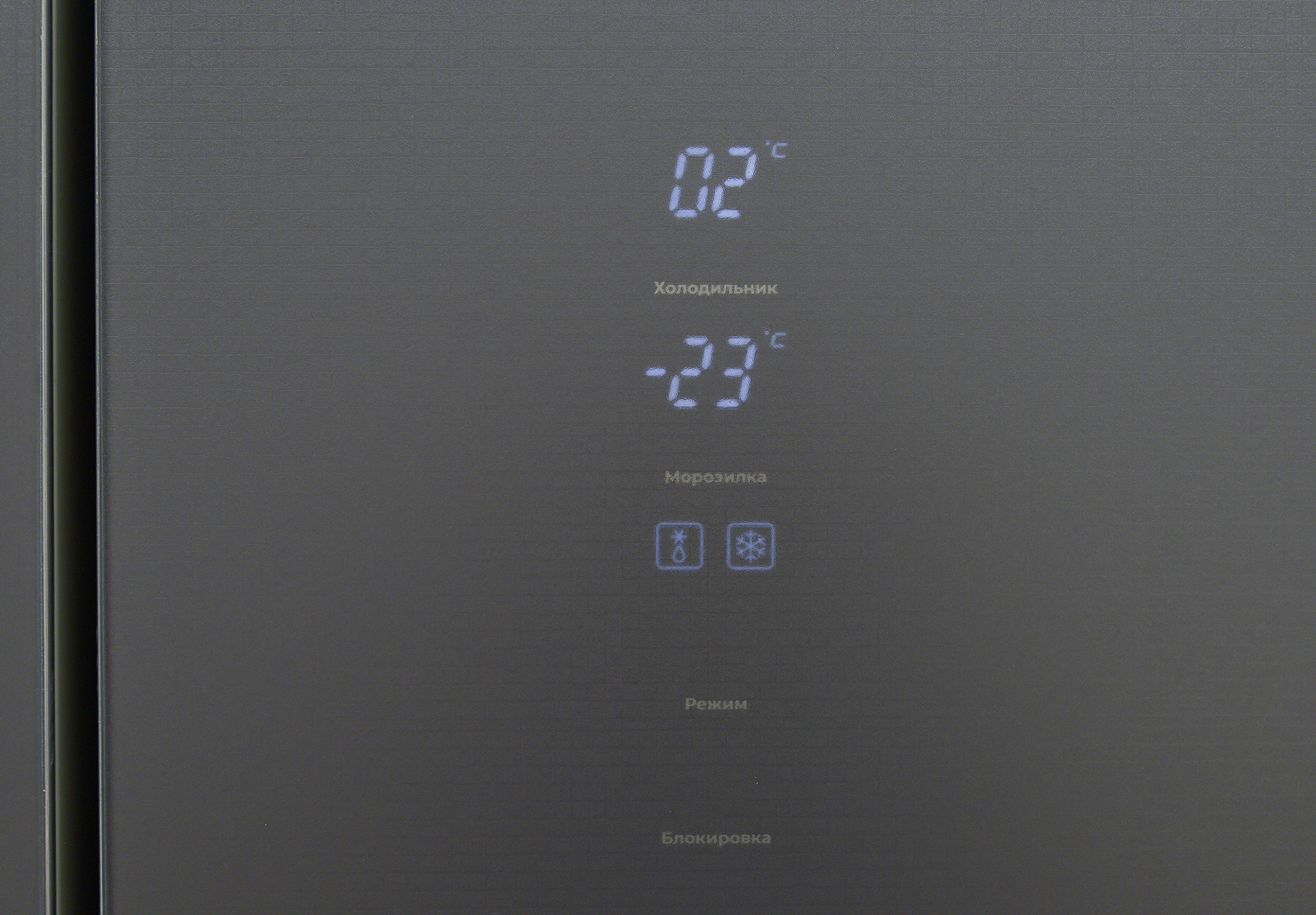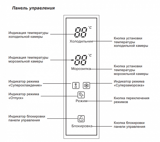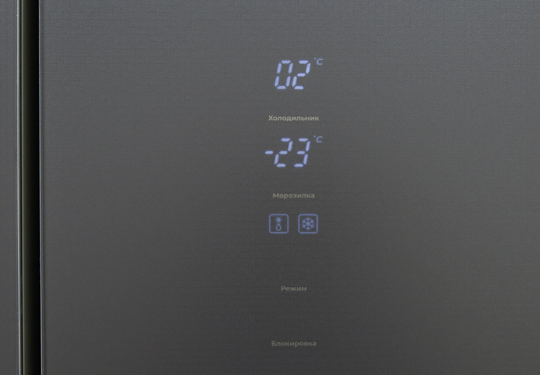 При открытии холодильника на панели зажигаются индикаторы установленной температуры холодильной и морозильной камер. Надписи «холодильник» и «морозилка» обозначают скрытые сенсоры, которые позволяют установить температуру воздуха в отделениях. Последовательными нажатиями можно выбрать значения от +2 °C до +8 °C для верхней камеры и от −15 °C до −23 °C для нижней. Шаг выбора — 1 градус.