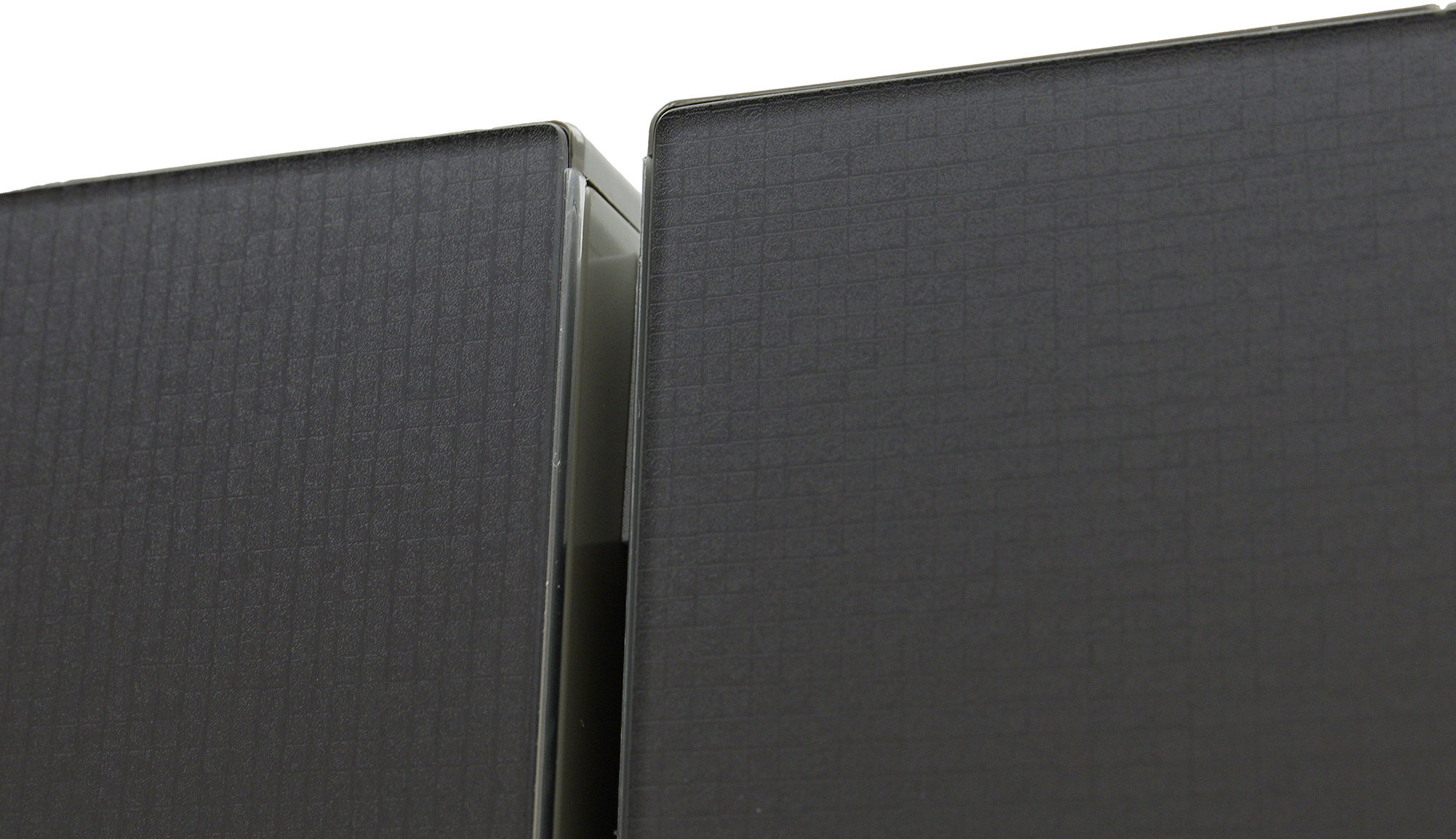Покрытие передних панелей выполнено из стекла с рельефом «под кожу». Материал выглядит стильно и красиво, приятен на ощупь, на нем не остается следов от пальцев.