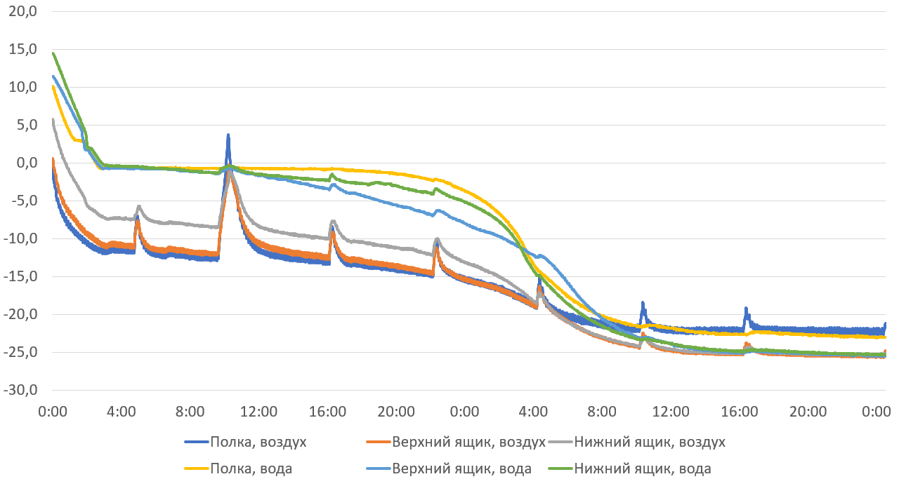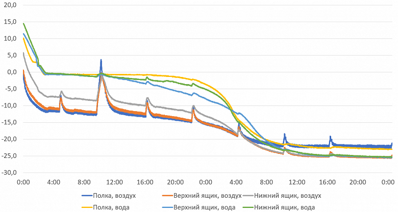 Чтобы оценить замораживающую способность холодильника, мы поместили по контейнеру с водой комнатной температуры на первую и четвертую полки морозильной камеры, третий контейнер разместили в верхнем ящике, после чего включили режим максимального охлаждения. Результаты измерений температуры воды и воздуха можно видеть на графике ниже.