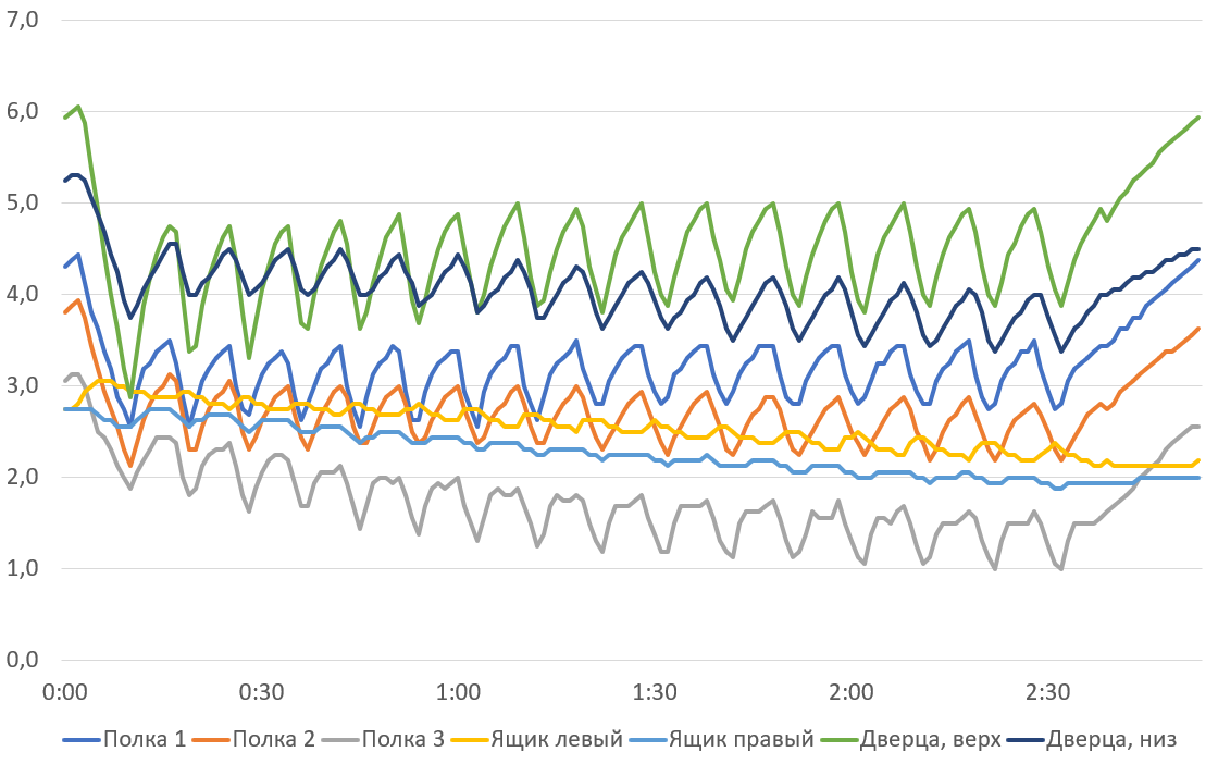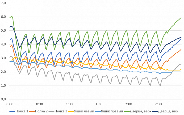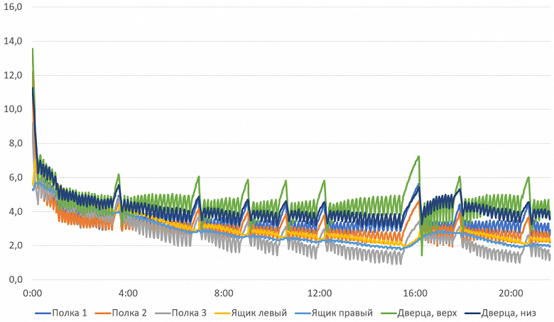 Считаем необходимым еще раз подчеркнуть, что приведенные графики иллюстрируют не потребительские качества холодильника, а особенности логики работы холодильного агрегата и циркуляции холодного воздуха между зонами камеры. Не следует удивляться таким, на первый взгляд, существенным колебаниям: охлажденные продукты обладают значительно большей тепловой инерцией, нежели воздух в камере, и переносят циклические изменения температуры нормально.