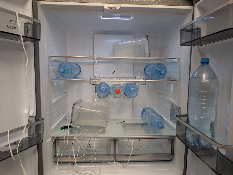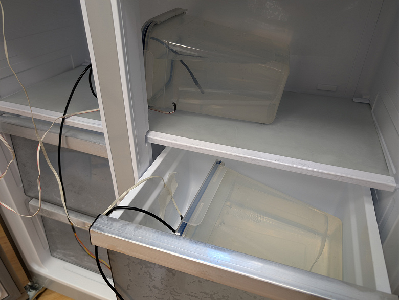 Три термодатчика в герметичном исполнении были размещены в трех четырехлитровых пластиковых контейнерах. Емкости мы наполнили водой и поставили в морозилку: одну на верхнюю полку, вторую — в правый средний ящик и третью — в правый нижний. Капсулы датчиков располагались по возможности ближе к центру контейнеров.