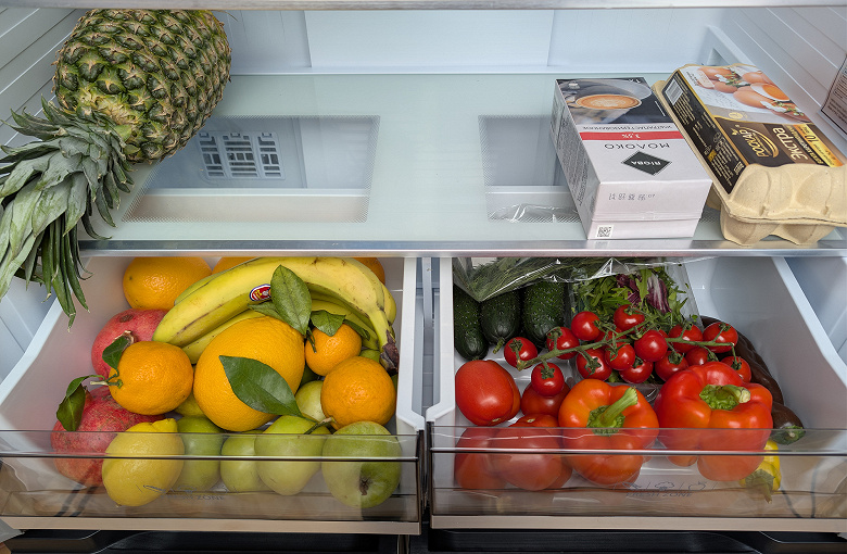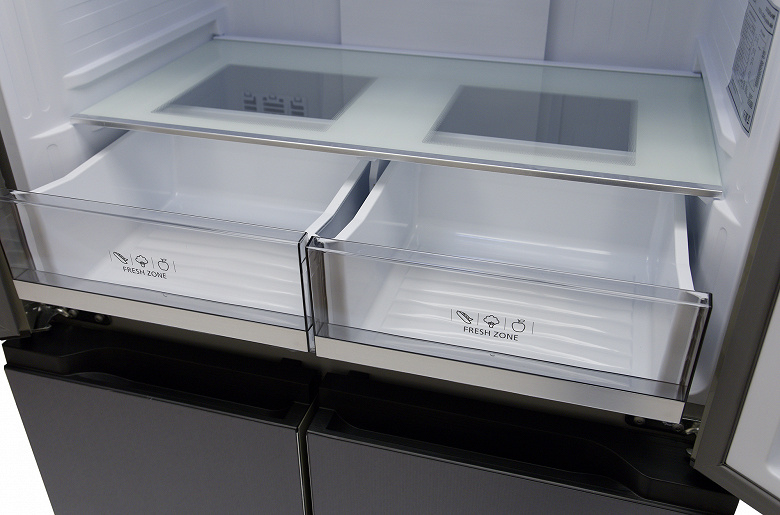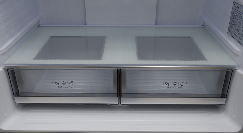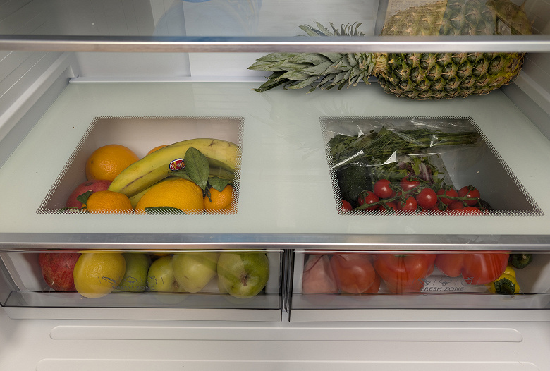 Наиболее ровный микроклимат — в ящиках зоны свежести. Перепад температуры и влажности здесь меньше всего, что позволяет сохранять зелень, фрукты и овощи свежими. При необходимости ящик можно использовать и для бережной разморозки замороженного мяса и рыбы.