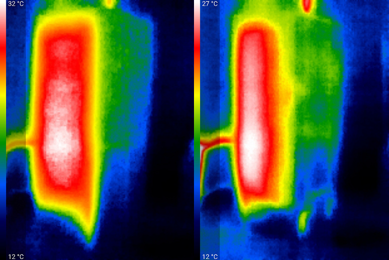 Боковые стенки, за которыми скрыты теплообменники, при работе нагреваются не слишком сильно. Как обычно, мы приводим фотографии включенного устройства в инфракрасном диапазоне.