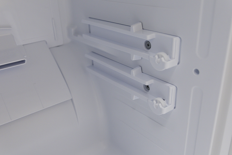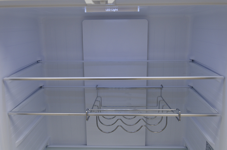 На стенках камеры три паза — при необходимости одну из полок можно переставить чуть ниже. К нижней полке крепится съемный металлический держатель для бутылок, рассчитанный на три емкости объемом до двух литров.