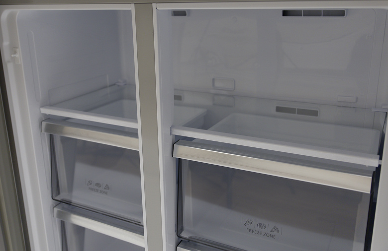 Внутри морозильного отделения — большая верхняя полка и четыре ящика. У всех четырех емкостей разный размер и конфигурация: левая сторона, как и в холодильном отделении, чуть поуже, а глубина у нижнего ряда немного меньше за счет расположенной на задней стороне корпуса ниши холодильного агрегата.