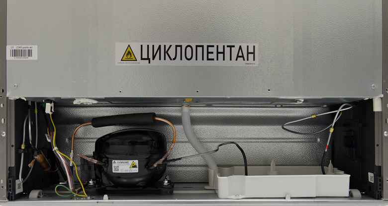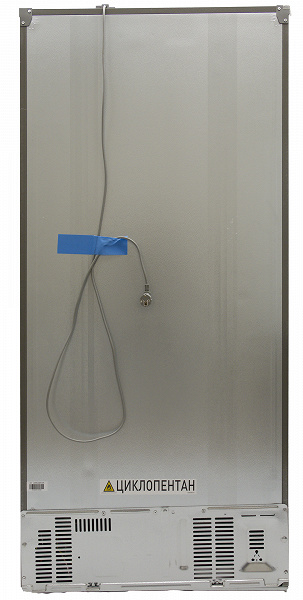 Темплообменники у этой модели убраны внутрь корпуса: металлическая задняя стенка гладкая, без выступающих элементов. Отсек холодильного агрегата закрыт крышкой, не препятствующей охлаждению компрессора, но защищающей конструкцию от загрязнений.