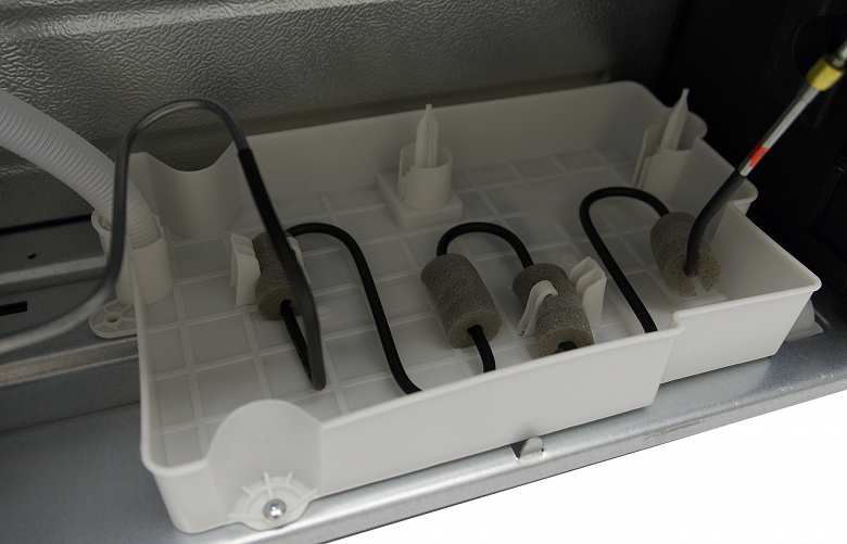Конденсат, образующийся при работе системы NoFrost, попадает в пластиковую ванночку. Образующаяся вода подогревается с помощью опущенной в емкость трубки и испаряется без вмешательства пользователя.