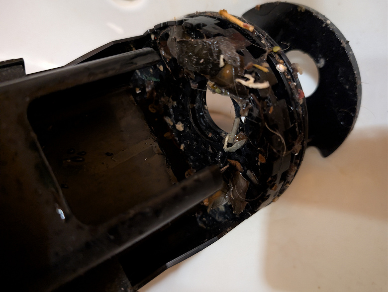 Очищать резервуар для грязной воды следует после каждой уборки — пылесос напоминает об этой необходимости. При чистке мусоросборника не стоит забывать про фильтр и сетчатый сепаратор: там могут скапливаться твердые загрязнения. Для ухода за контейнером удобно использовать прилагающийся ершик.