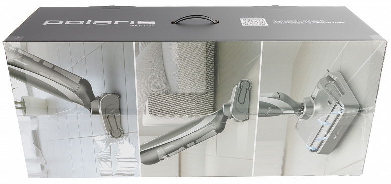 Пылесос приехал к нам в большой коробке с полноцветной печатью. Надписей на ней немного: дополнительную информацию о модели можно узнать, воспользовавшись QR-кодом на верхней стороне, рядом с пластиковой ручкой.