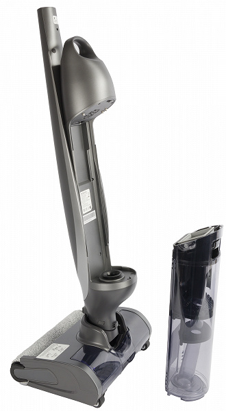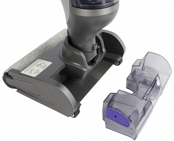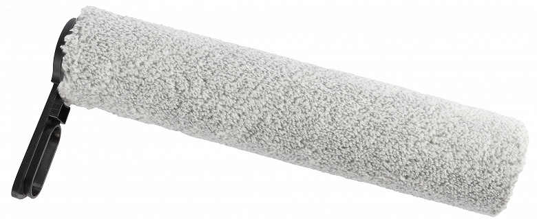 В передней части насадки вращается роликовая щетка из мягкого впитывающего материала. Любопытно, что ротор не прикрыт традиционной полупрозрачной крышкой, защищающей от брызг воды, хотя выступы для ее крепления на корпусе есть. При первом знакомстве с устройством мы даже поискали этот элемент внутри коробки, решив, что он затерялся среди упаковочных материалов, но, ознакомившись с промо-изображениями пылесоса, поняли, что в этой модели защитный кожух не предусмотрен.