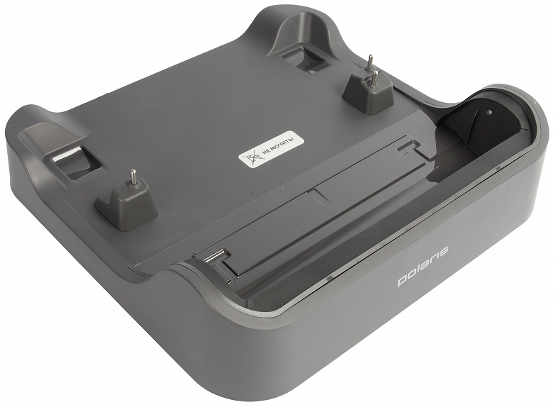 Базовая станция предназначена для зарядки и самоочистки устройства. Для подключения прибора служат подпружиненные электроконтакты, выступающие над поверхностью корпуса.
