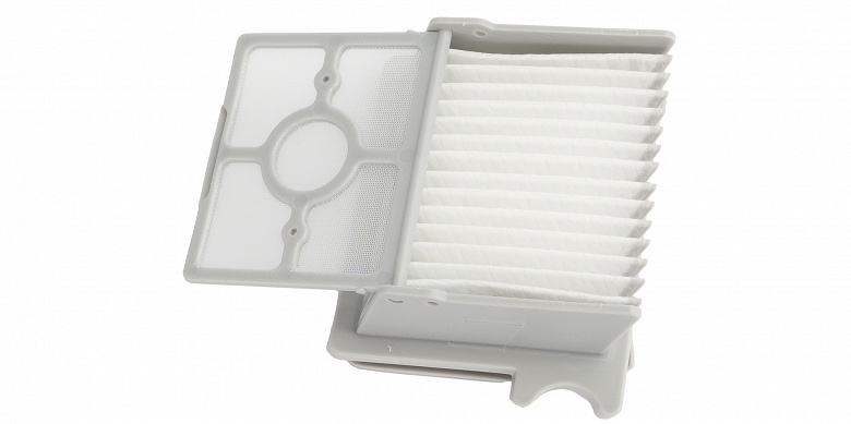 Поток воздуха покидает контейнер через влагоустойчивый HEPA-фильтр стандартной конструкции. Гармошку фильтрующего элемента защищает прочная капроновая сетка на откидной рамке.
