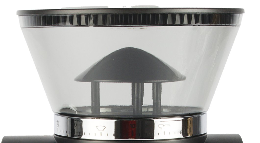 Компоновка традиционная: в верхней части кофемолки находится бункер объемом около двух литров с предохранительным конусом черного цвета. В бункер можно засыпать 600—800 г кофе, однако в технических данных в качестве максимальной загрузки указано 160 г зерен. На практике это означает, что слой зерен не должен полностью засыпать предохранительный конус бункера.