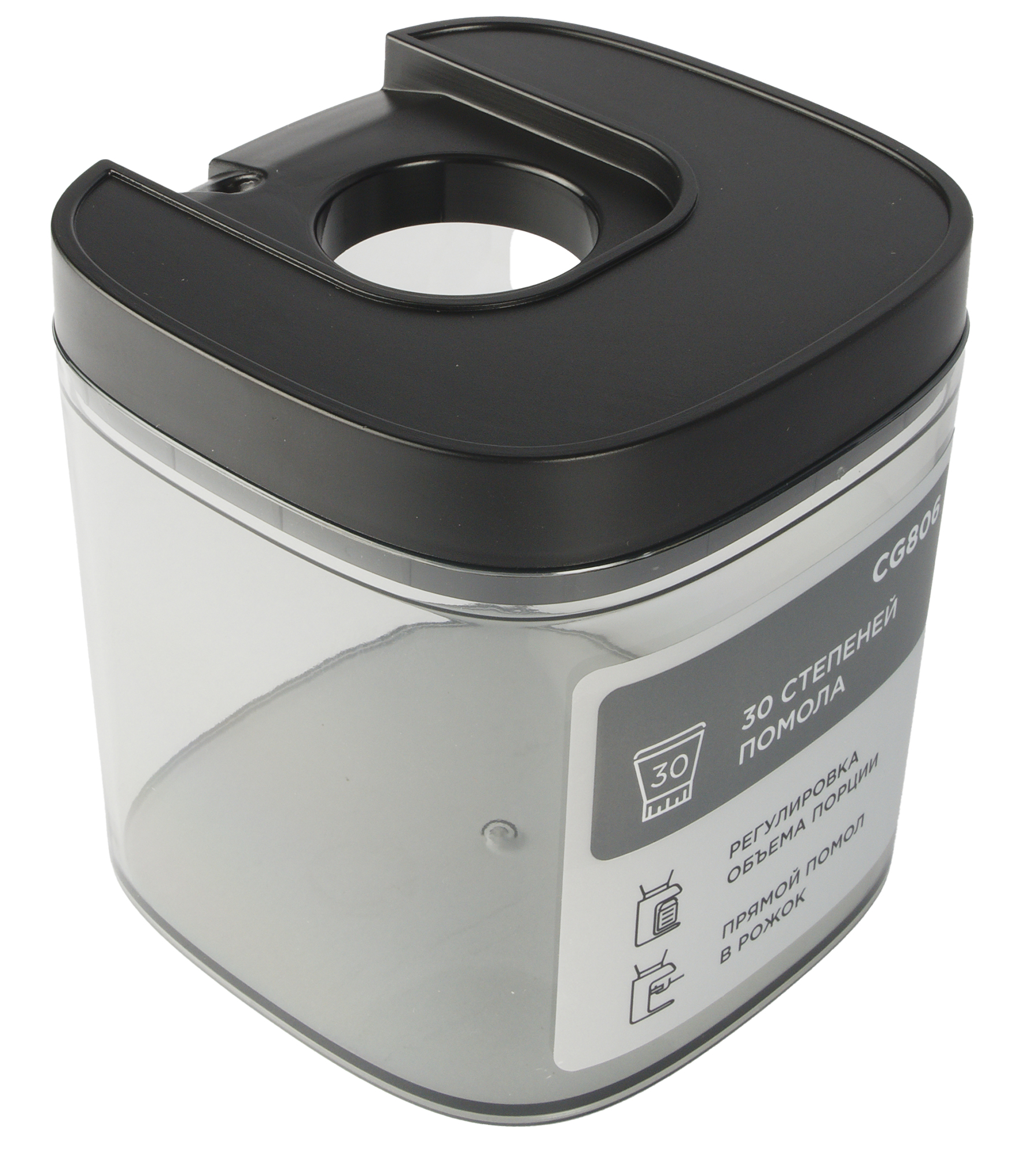 Контейнер для молотого кофе объемом 450 мл выполнен из прозрачного пластика. Крышка из черного пластика имеет отверстие по центру и выемку для фиксации на кофемолке в задней части. Пробки или сплошной крышки не предусмотрено, так что долго хранить молотый кофе в контейнере не стоит: если вы собираетесь намолоть зерен с запасом, следует пересыпать молотый кофе в другую емкость.