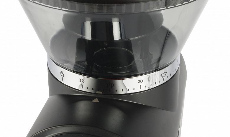 Как мы уже упоминали выше, размер помола настраивается поворотом контейнера для зерен относительно корпуса кофемолки. На нем нанесены риски от 30 (самый крупный) до 0 (самый мелкий). Переключение помола ступенчатое, поэтому особо точная регулировка нам недоступна.