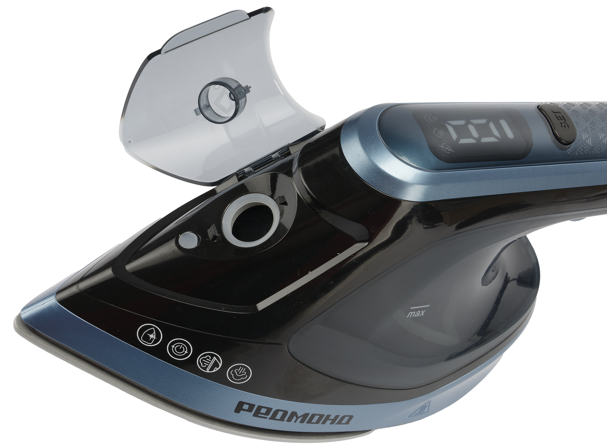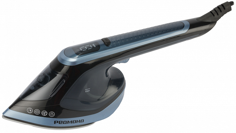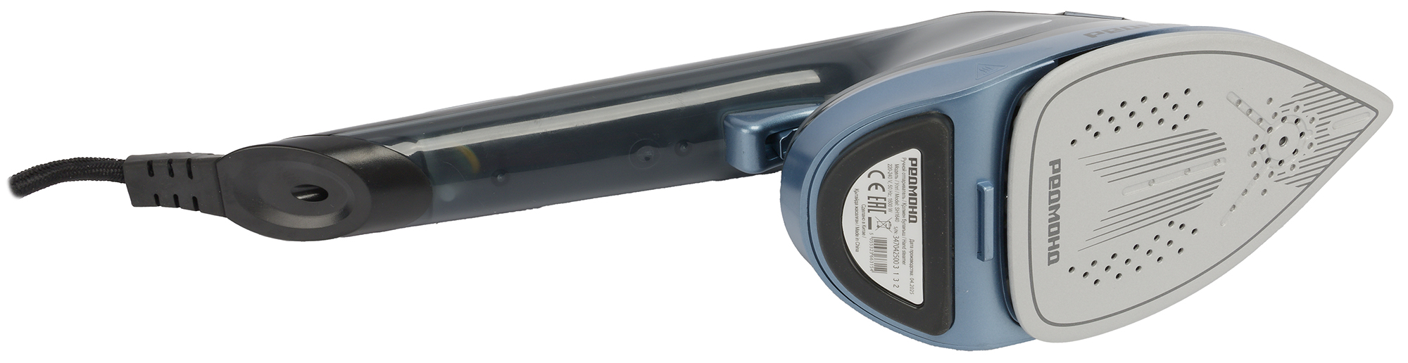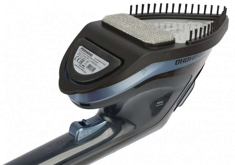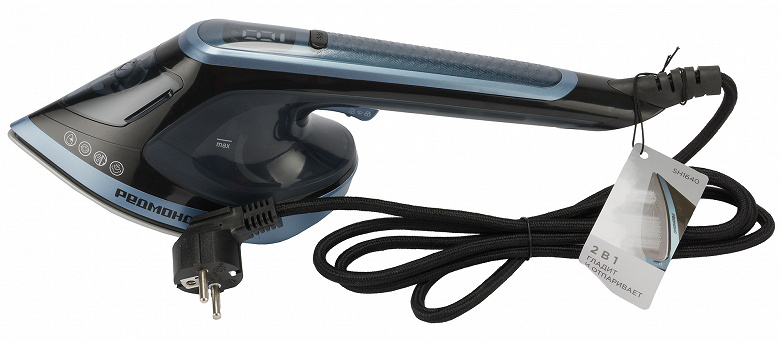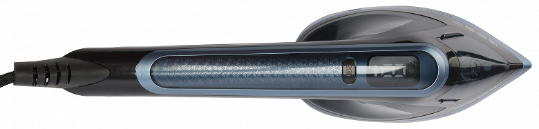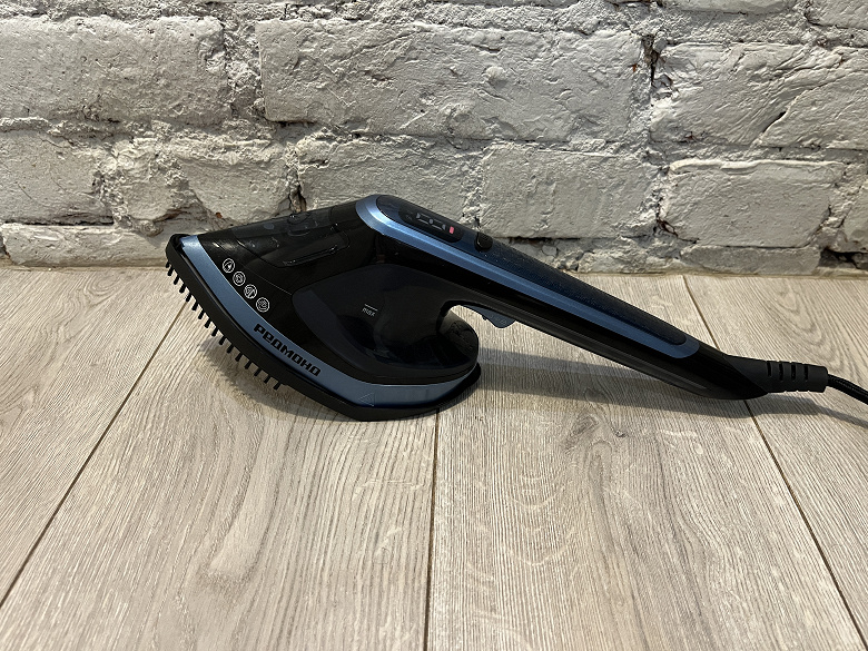 Корпус отпаривателя выполнен из черного и синего пластика. Он имеет нестандартную вытянутую форму за счет значительно удлиненной ручки. Стоять на подошве прибор не может, так как центр тяжести у него смещен в сторону ручки (и даже наполненный резервуар с водой этого не меняет). Его устойчивое положение — две точки опоры — скошенная грань за подошвой и пластиковая ножка в конце ручки, над которой выходит шнур электропитания. Благодаря такому решению прибор во время работы можно будет без опаски опустить на любую рабочую поверхность — подошва к ней прислониться не сможет.
