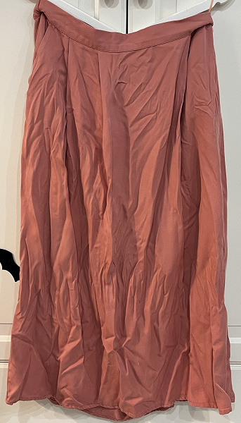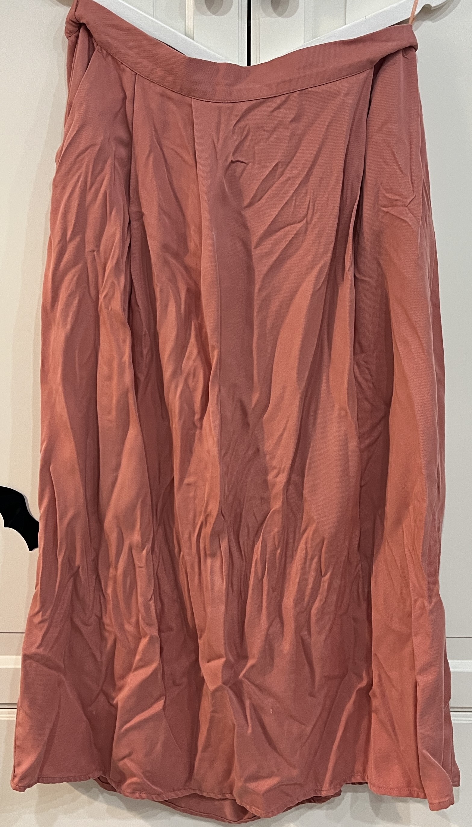 Сильно помятая и состоящая на 95% из натуральной ткани юбка полностью разгладилась за 3 минуты. Здесь мы вновь прибегли к комбинированному отпариванию, но не из-за сложности ткани, а для того, чтобы сделать четкие линии от защипов.