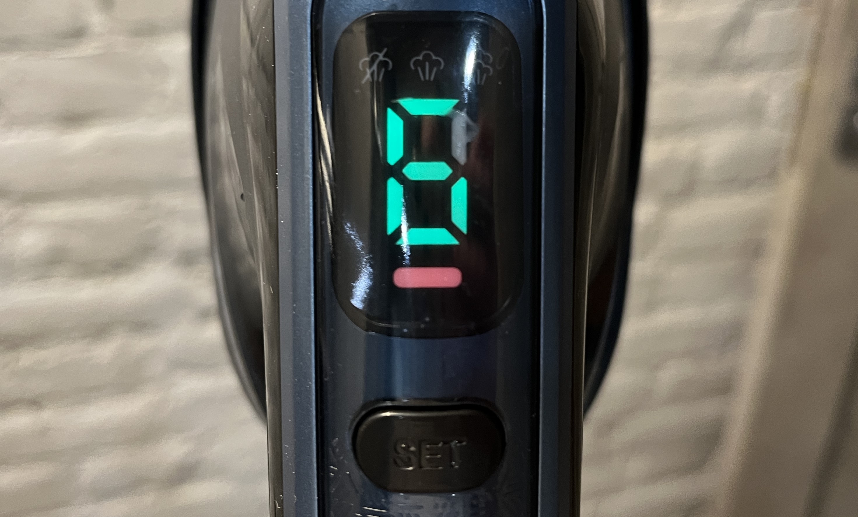 Далее нажимаем кнопку включения и ждем пока прибор выйдет на рабочую температуру. На это у него уходит 16 секунд (по инструкции 25). Индикатор режима работы продолжает непрерывно гореть красным цветом, а на дисплее начинается обратный отсчет от цифры 9. Как только достигнута цифра 0 — можно приступать к отпариванию.