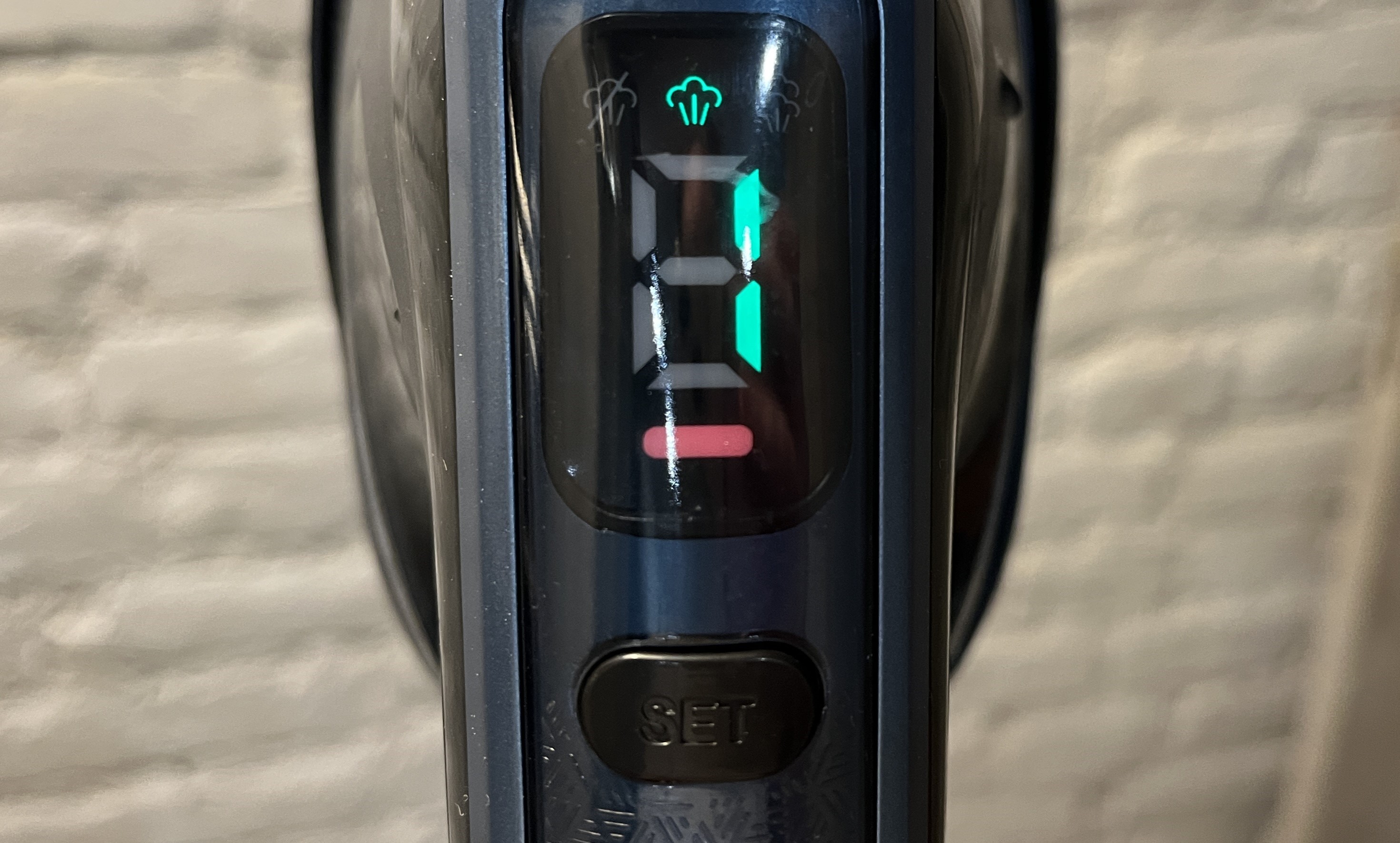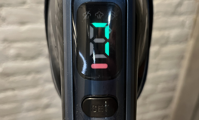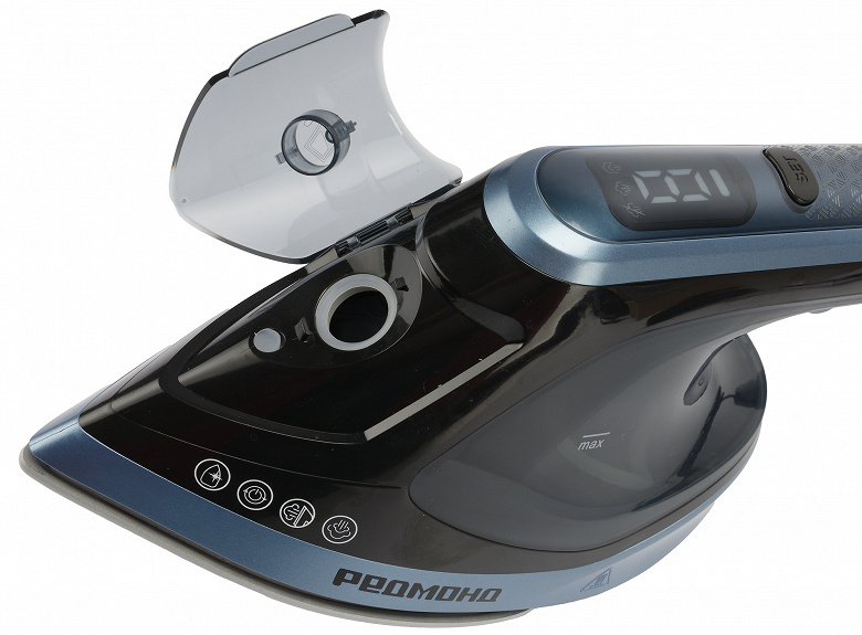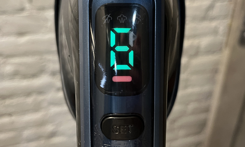 Помимо нуля над дисплеем загорается индикатор текущего активного режима работы. Всего их три: глажение без пара, легкое отпаривание и режим максимальной подачи пара.