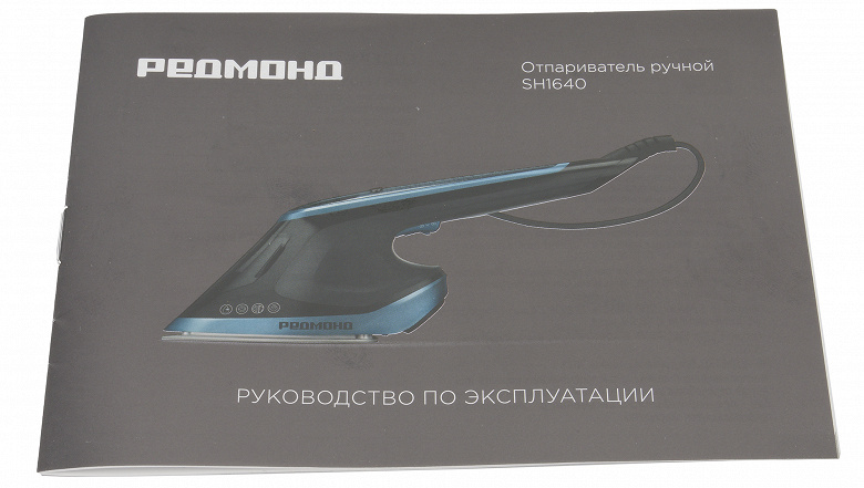 Внутри коробки комплектующие упакованы в полиэтилен и надежно закреплены картонными вкладками. Кроме самого отпаривателя из коробки мы извлекли: насадку-щетку, мерный стакан, руководство по эксплуатации и гарантийный талон.
