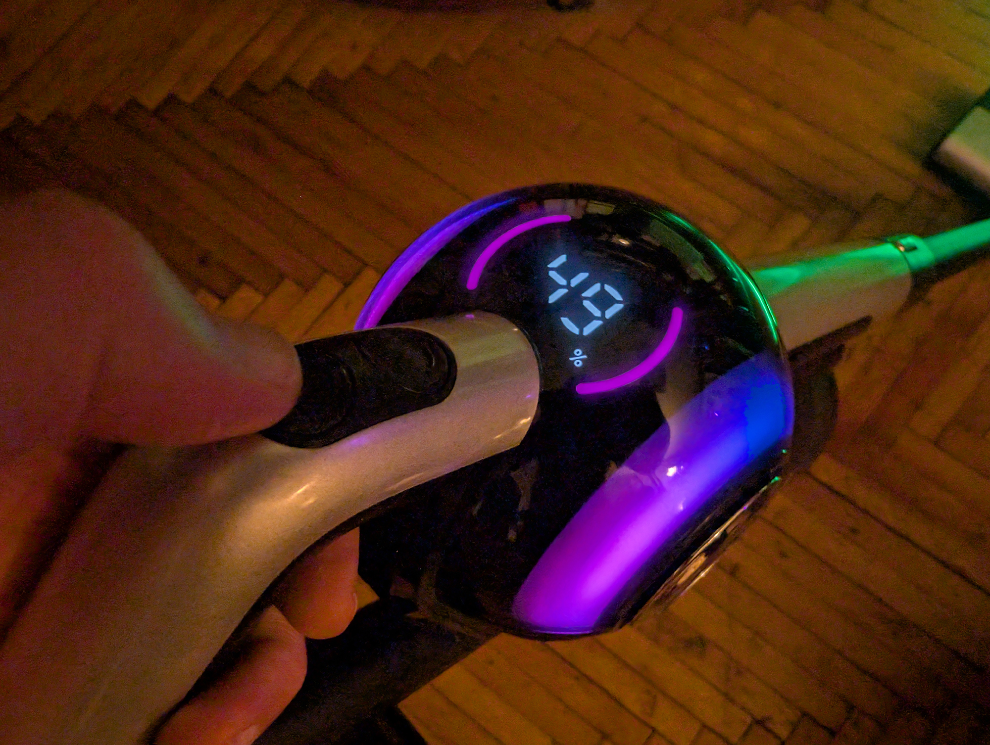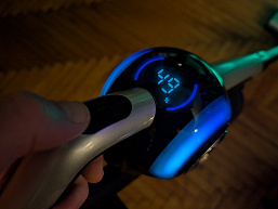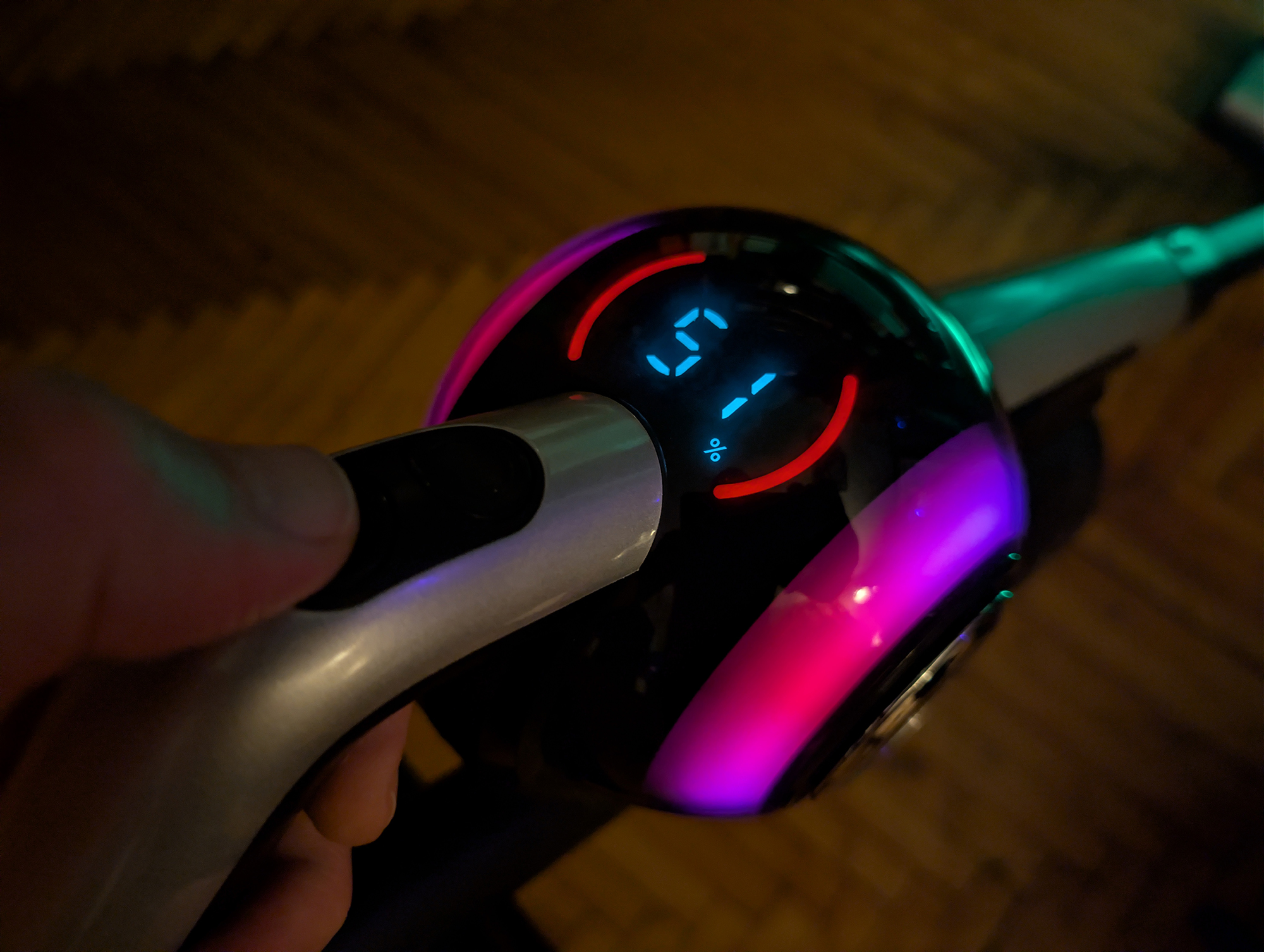Уровень заряда отображается в процентах на цифровом дисплее. Боковые стенки моторного отсека подсвечиваются при работе, изменяя цвет в зависимости от выбранной мощности: красный свет обозначает максимальный режим, фиолетовый соответствует среднему, а синий — экономичному.