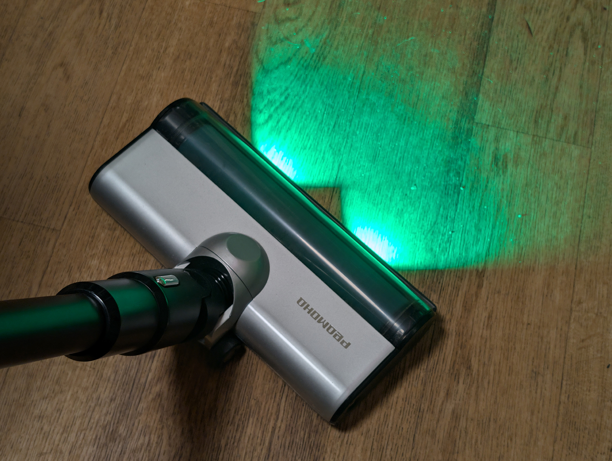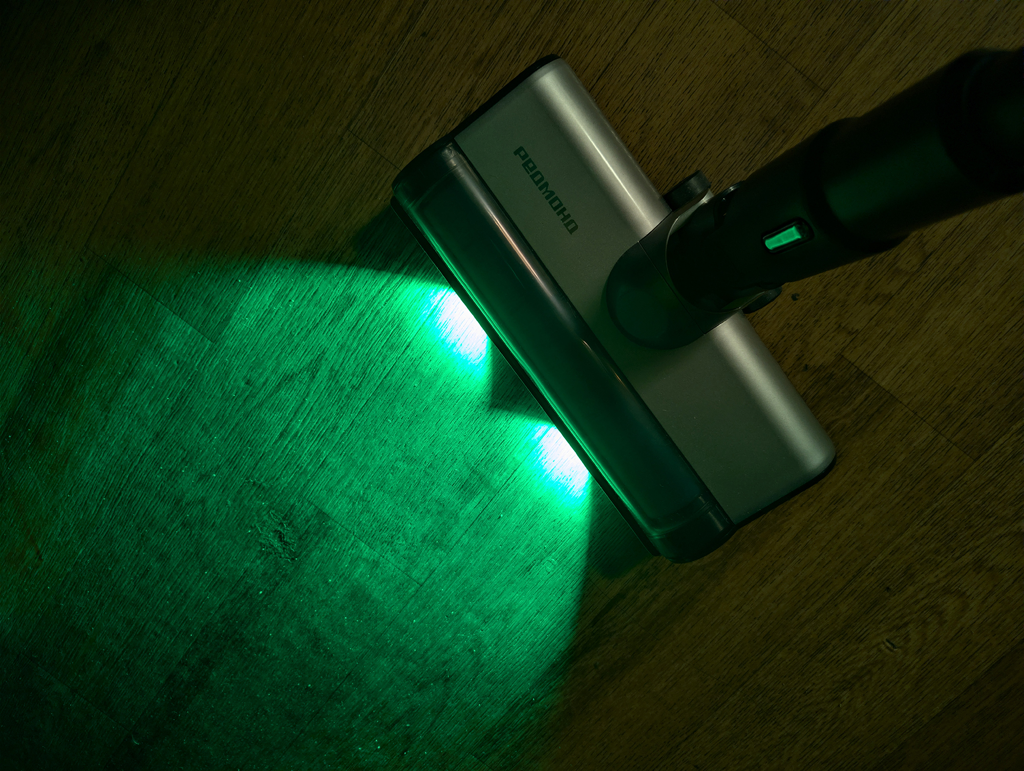 Яркая зеленая подсветка рабочей зоны одинаково эффективна как в полумраке, так и при дневном или электрическом свете: низко расположенные источники света позволяют замечать фрагменты мусора, плохо различимые при обычном освещении.