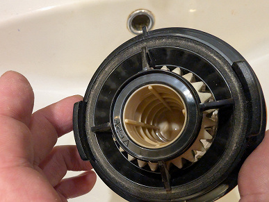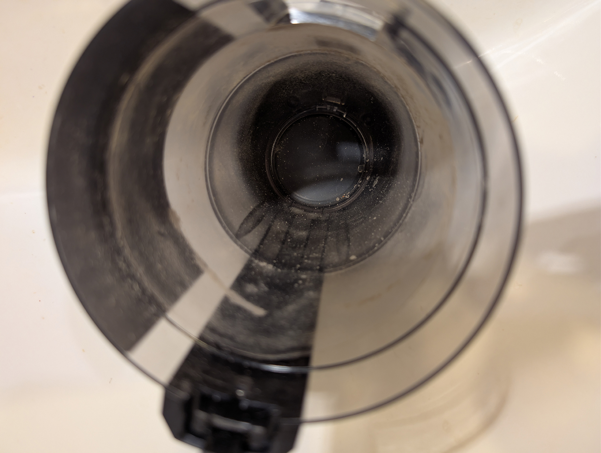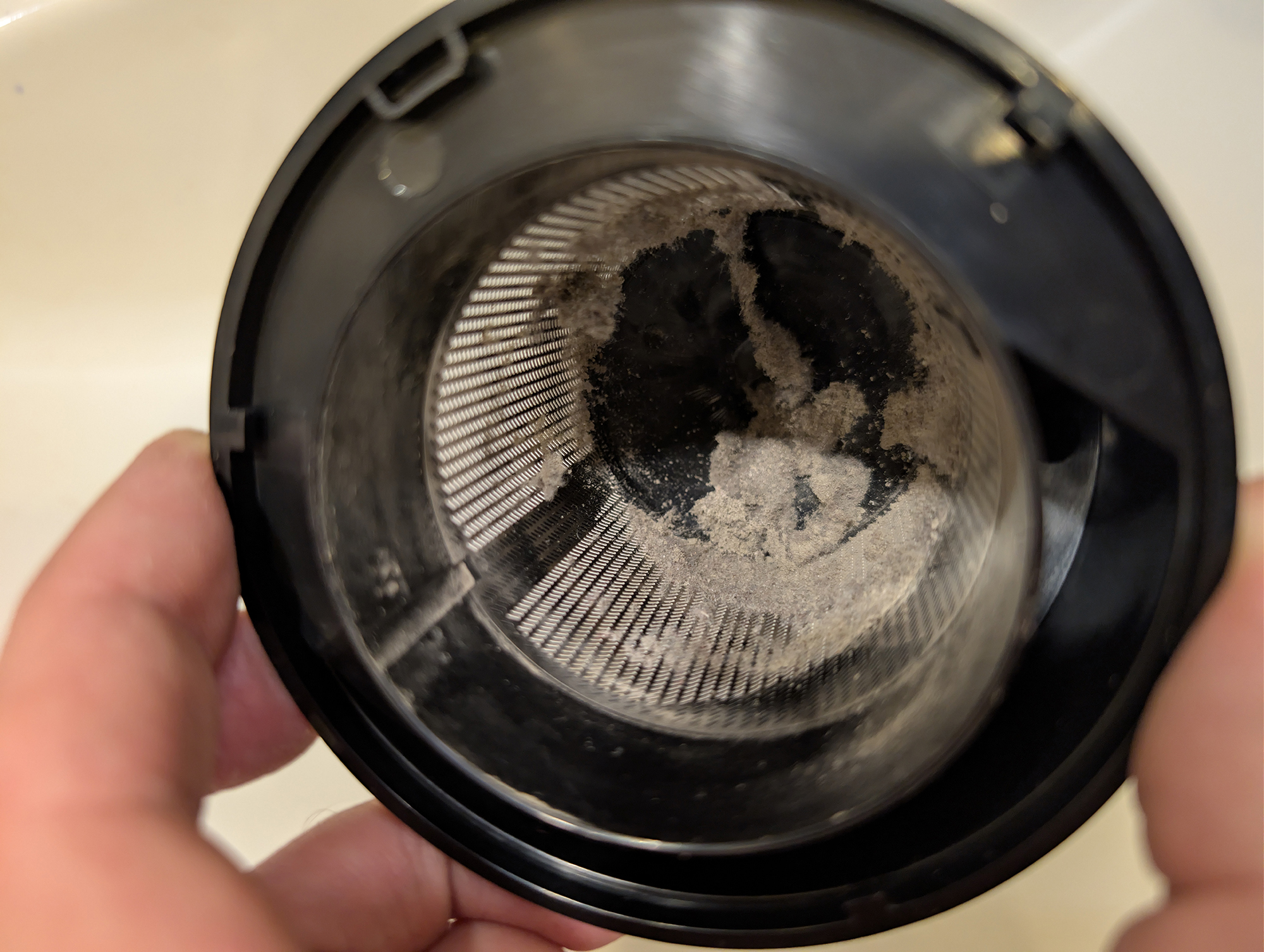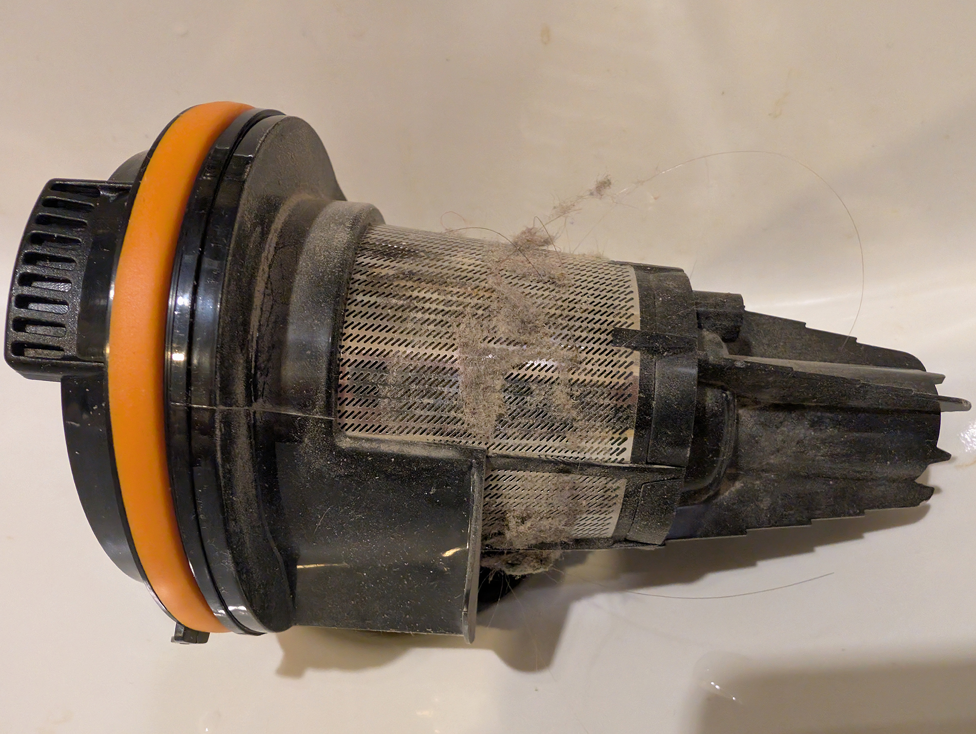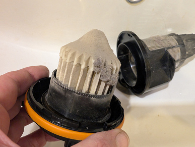 Чуть хуже обстоят дела с мелкой пылью, скапливающейся в области стальной решетки циклонного элемента: даже после троекратного запуска самоочистки мы видим здесь заметные загрязнения.
