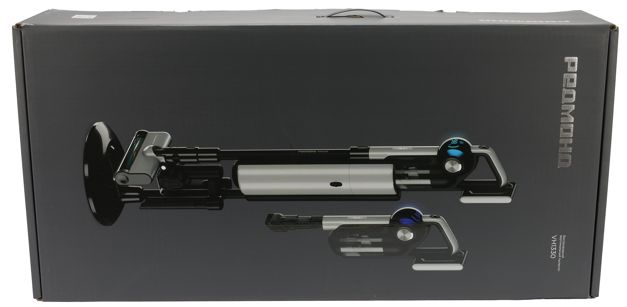 Пылесос поставляется в большой картонной коробке, оформленной в фирменном стиле Redmond. На передней стороне мы видим два изображения устройства: на базовой станции и в конфигурации для ручной уборки.