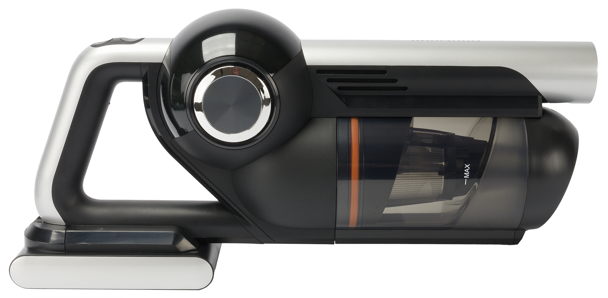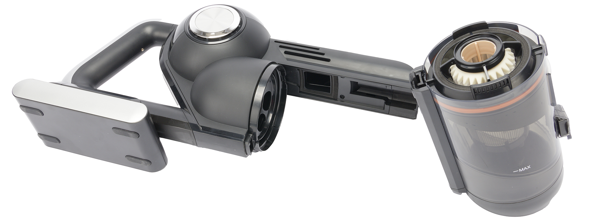 У пылесоса хороший баланс, он легко управляется и комфортно лежит в руке. Центр тяжести распределен оптимально: и без того небольшой вес не затрудняет ни подметание, ни ручную уборку. Маневренность насадки, которая без усилий поворачивается вперед-назад и вправо-влево, нас порадовала, однако огорчительно, что у нее нет парковочного положения. При паузах в уборке пылесос приходится прислонять к стенам и мебели, что может привести к падению и повреждению.