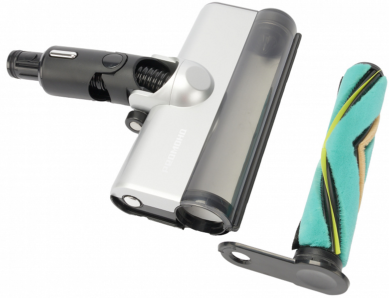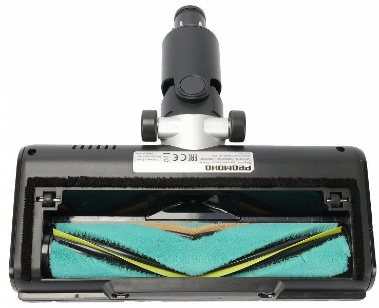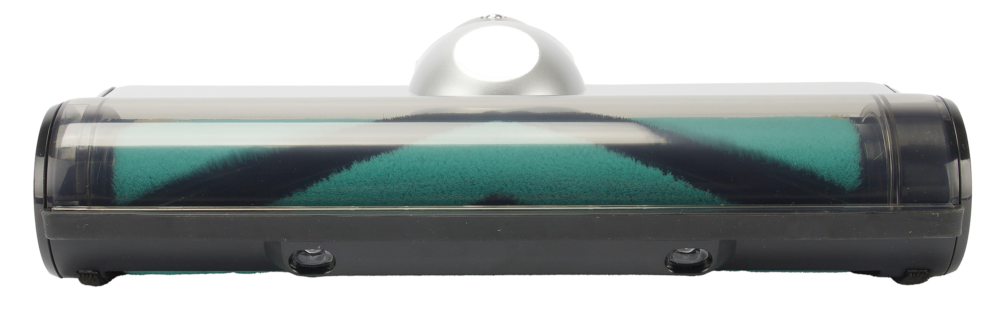 При необходимости очистки и обслуживания ротор легко извлекается с торца насадки. Он оборудован V-образными рядами чистящих элементов трех типов: силиконовыми ламелями, мягкими велюровыми щетками и жесткой щетиной — соответственно желтого, лазурного и бежевого цветов. Такая конструкция обеспечивает одинаковую эффективность как на гладких полах, так и на мягких ковровых покрытиях.